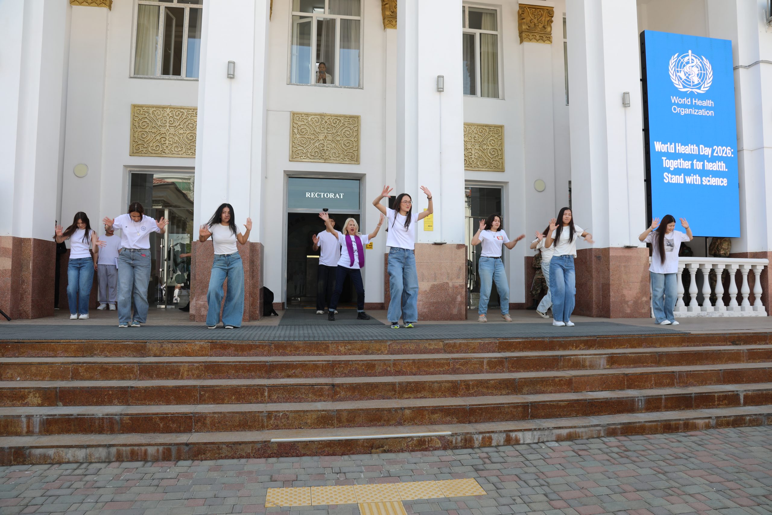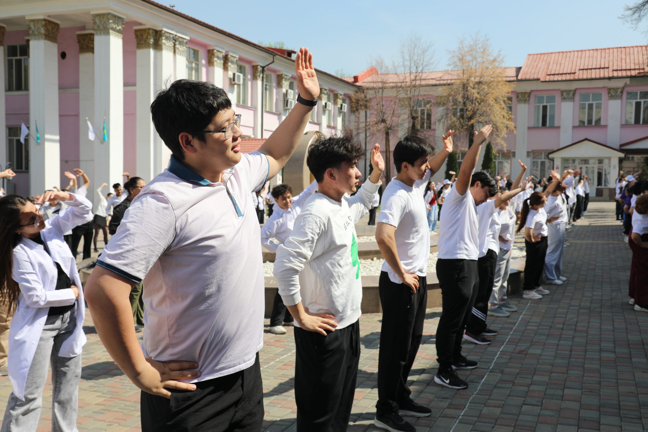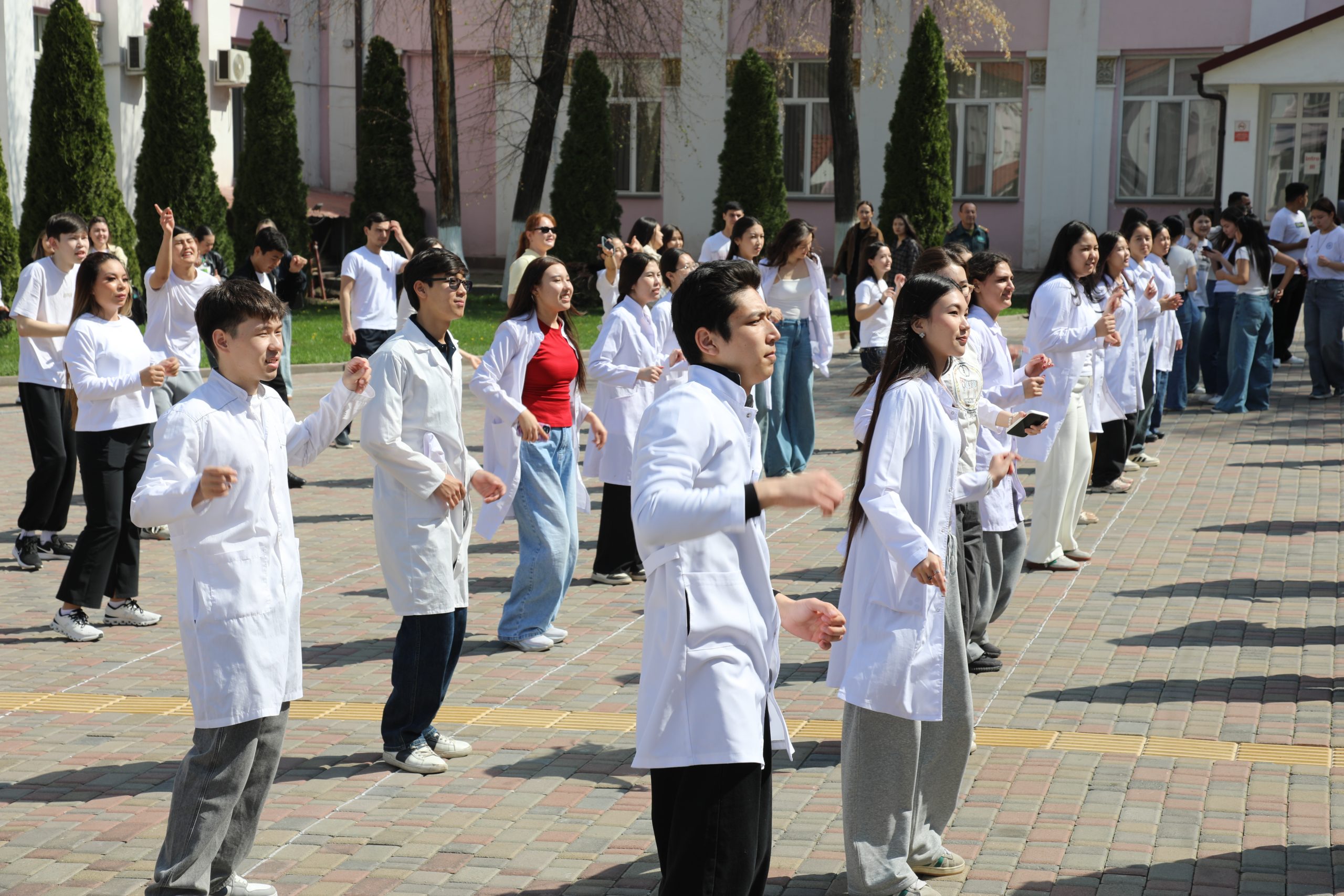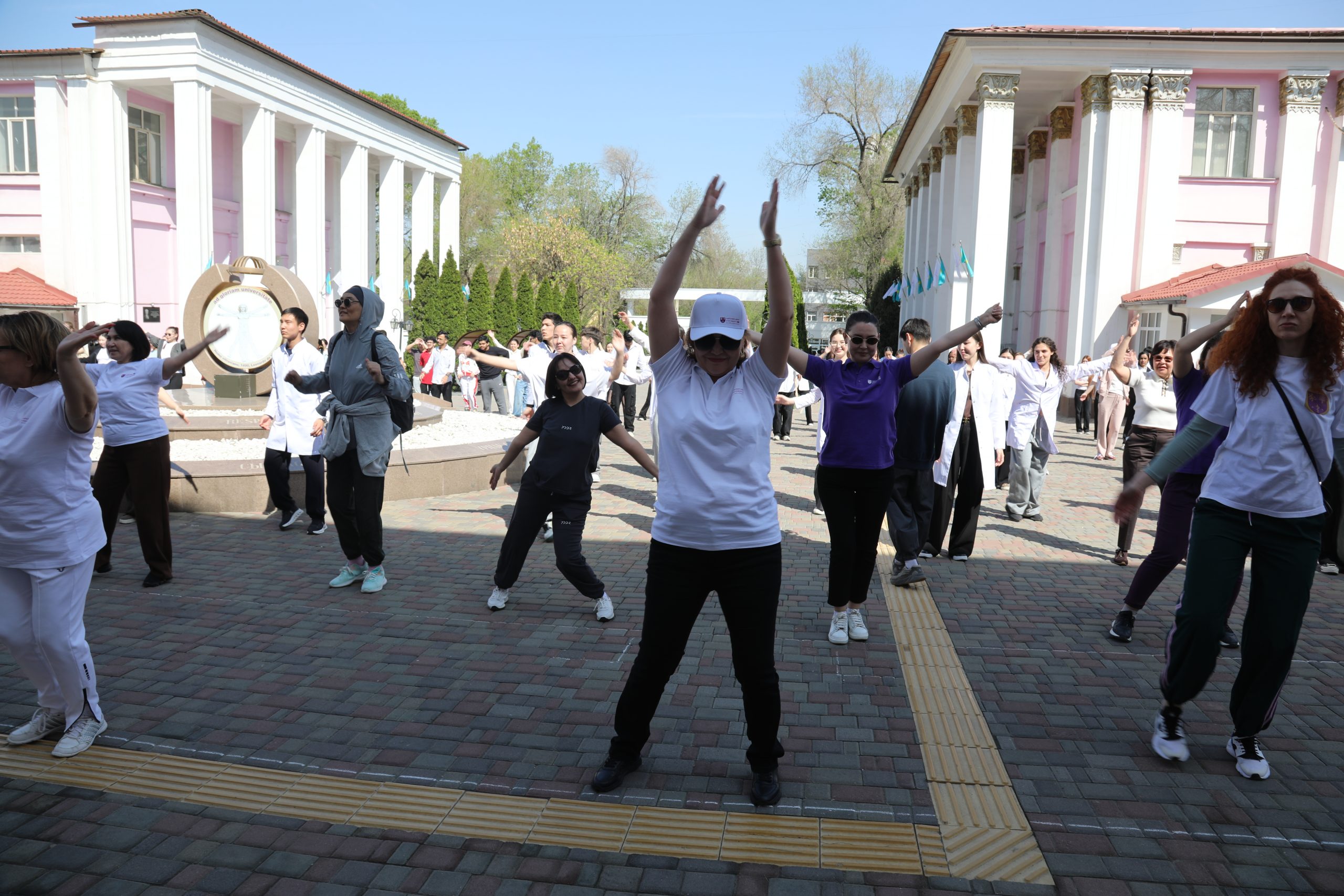 В Казахском национальном медицинском университете имени С. Д. Асфендиярова 7 апреля состоялся масштабный флешмоб, приуроченный ко Всемирному дню здоровья. В акции приняли участие студенты, преподаватели, сотрудники университета, а также ректор КазНМУ Марат Шоранов и руководитель Европейского центра ВОЗ по первичной медико-санитарной помощи в Алматы д-р Мелитта Якоб.