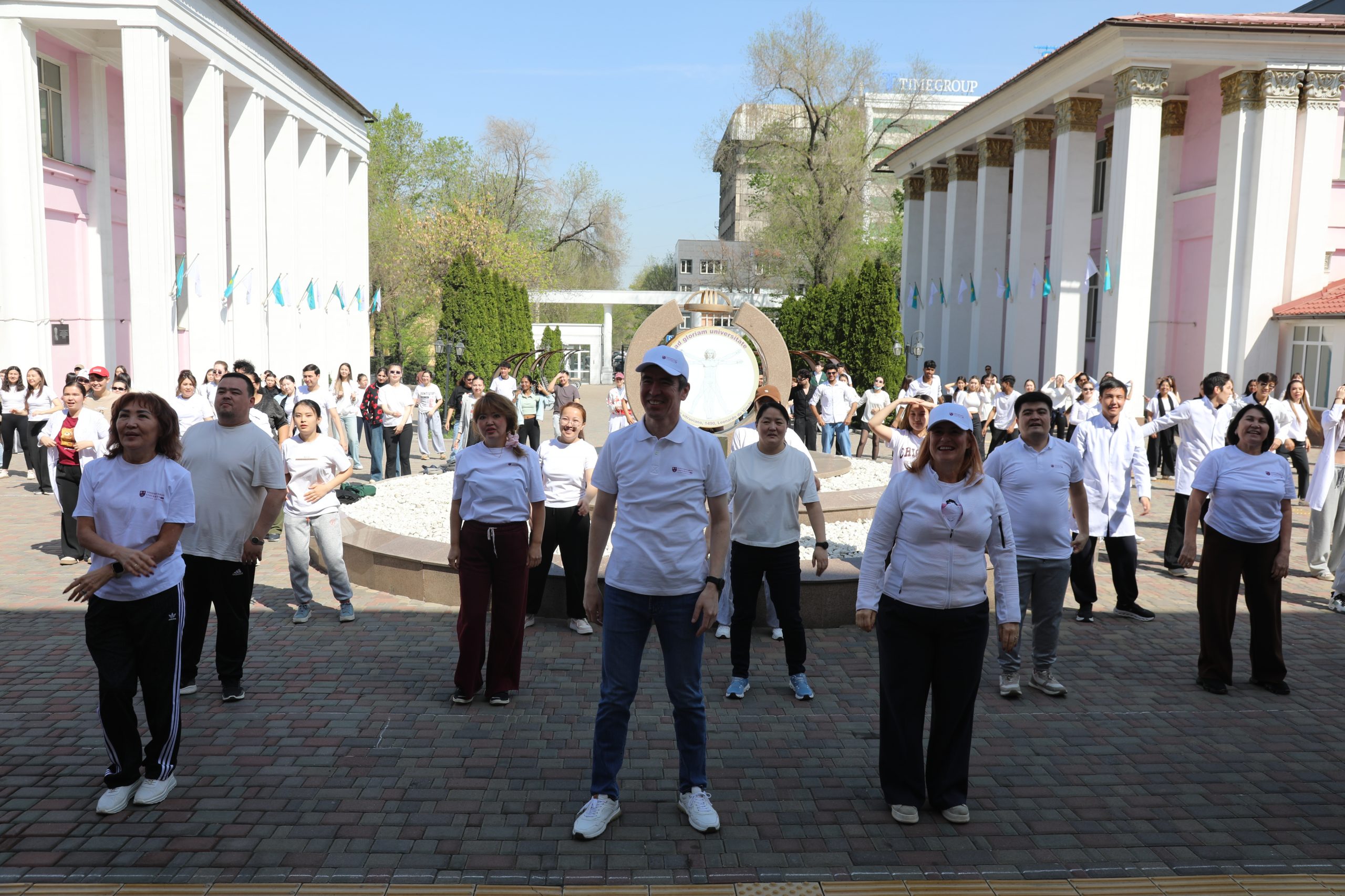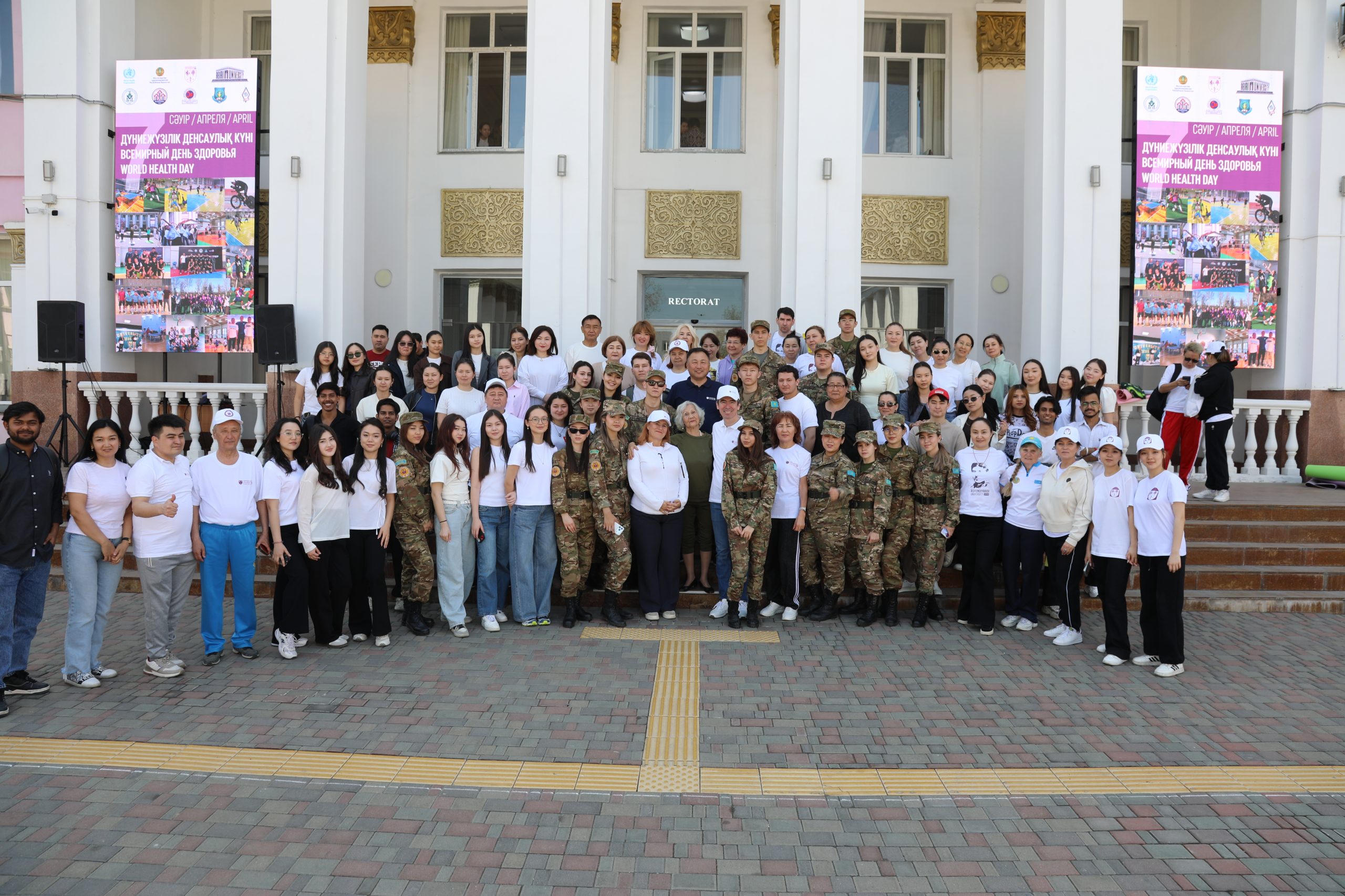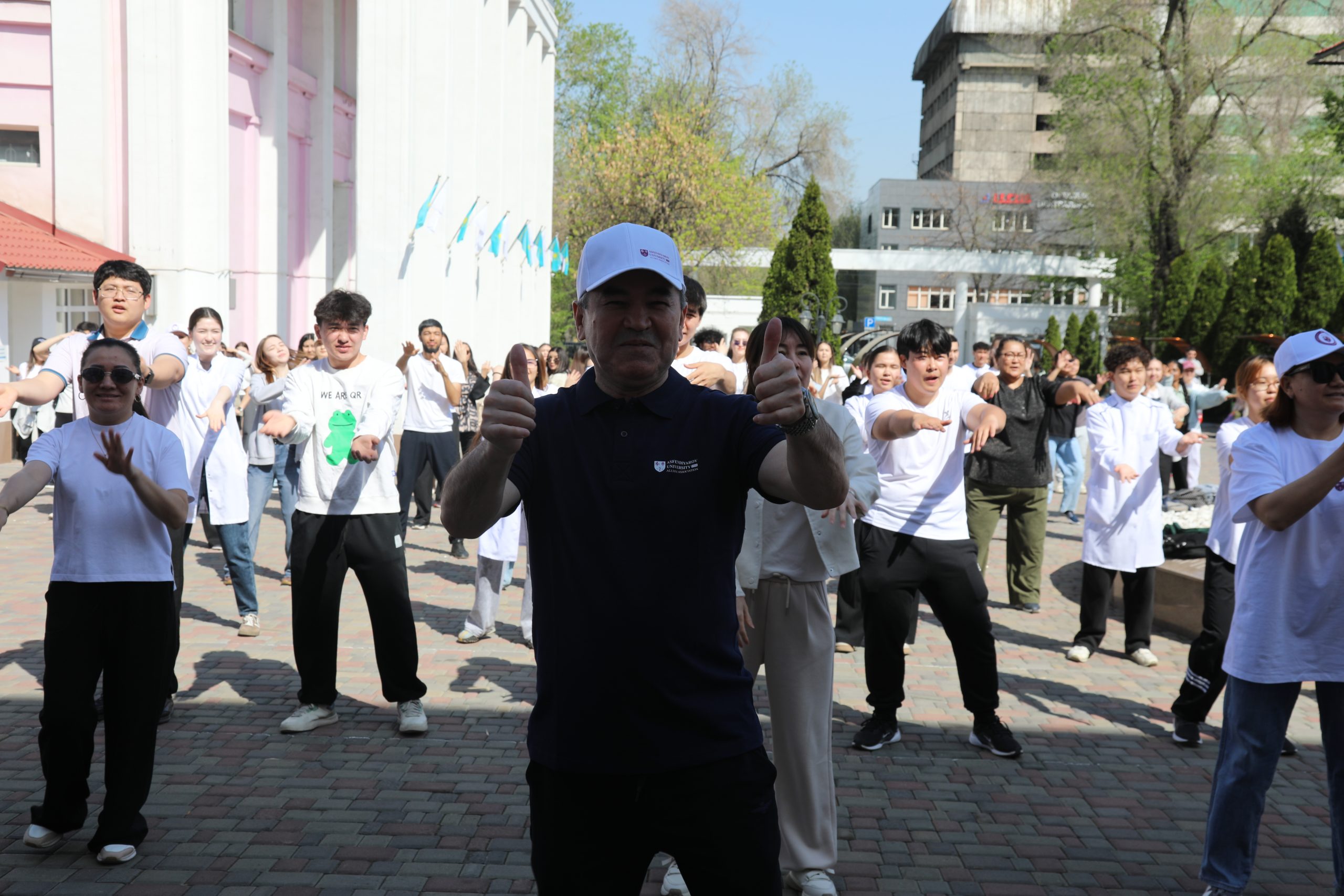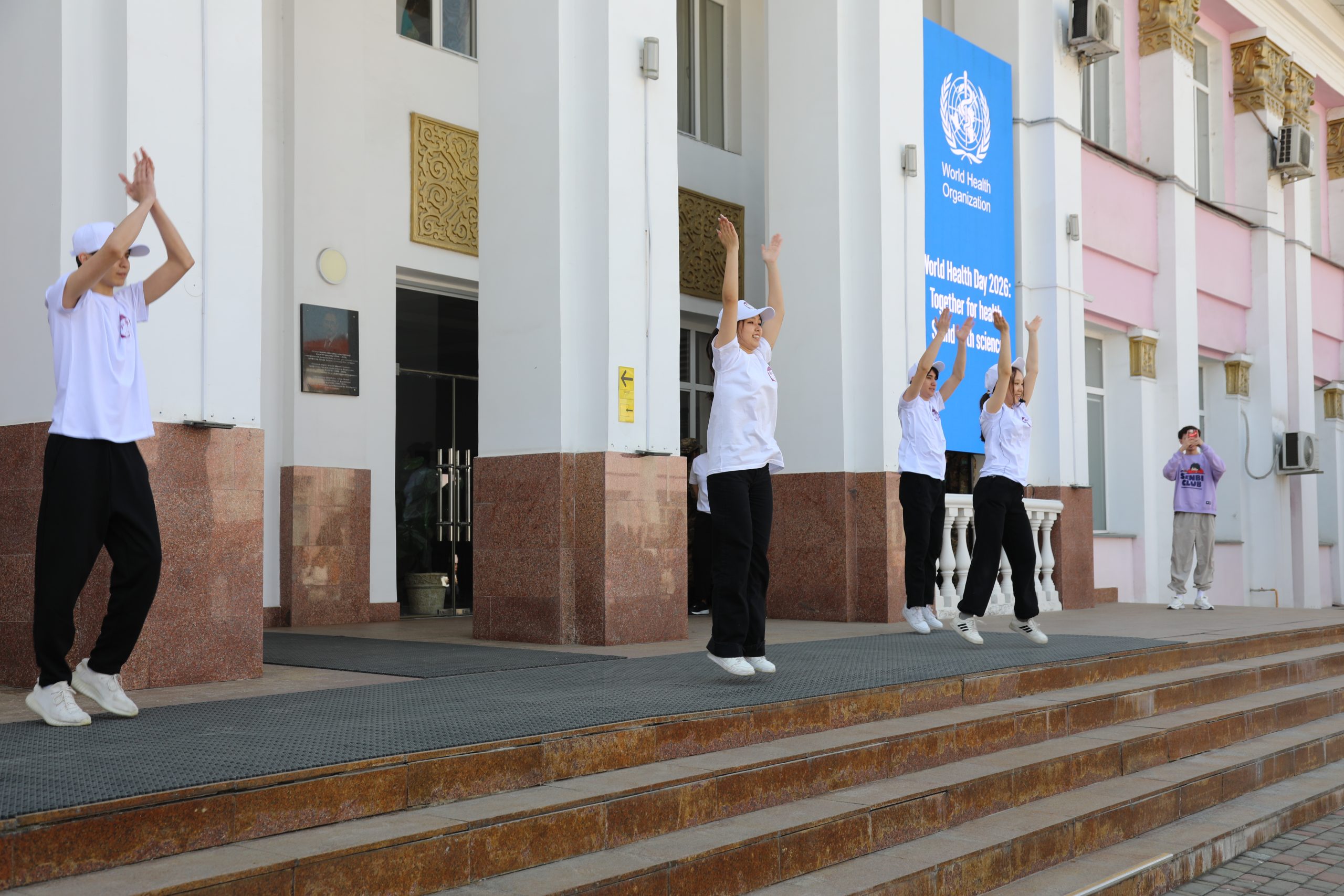 В Казахском национальном медицинском университете имени С. Д. Асфендиярова 7 апреля состоялся масштабный флешмоб, приуроченный ко Всемирному дню здоровья. В акции приняли участие студенты, преподаватели, сотрудники университета, а также ректор КазНМУ Марат Шоранов и руководитель Европейского центра ВОЗ по первичной медико-санитарной помощи в Алматы д-р Мелитта Якоб.