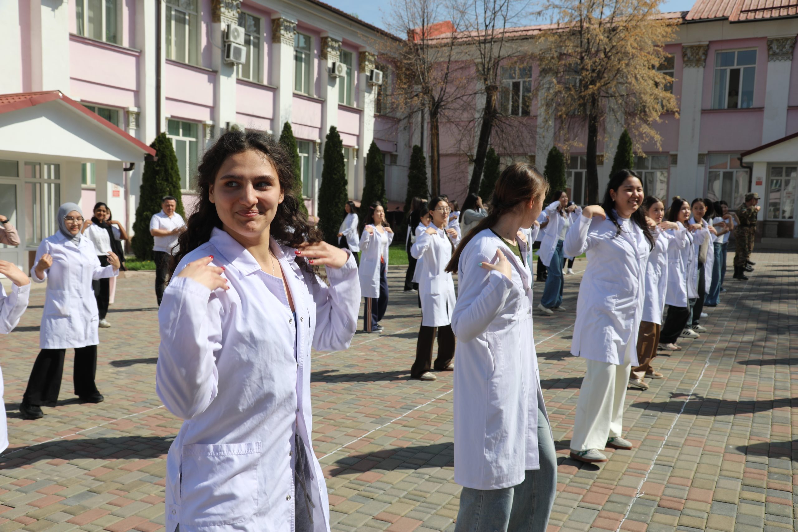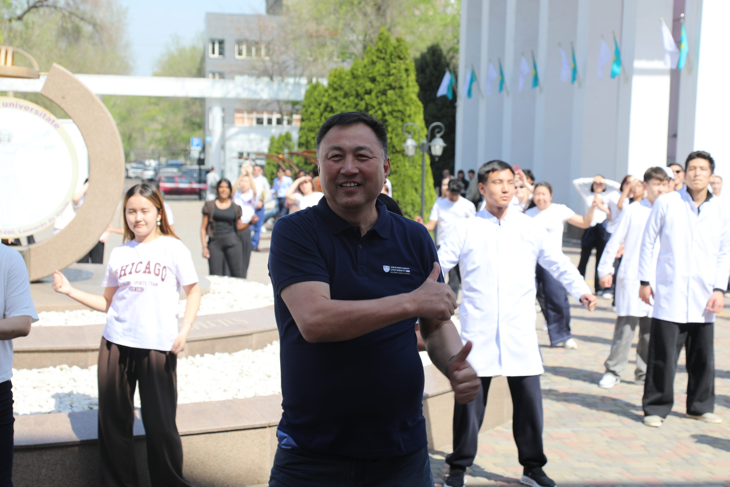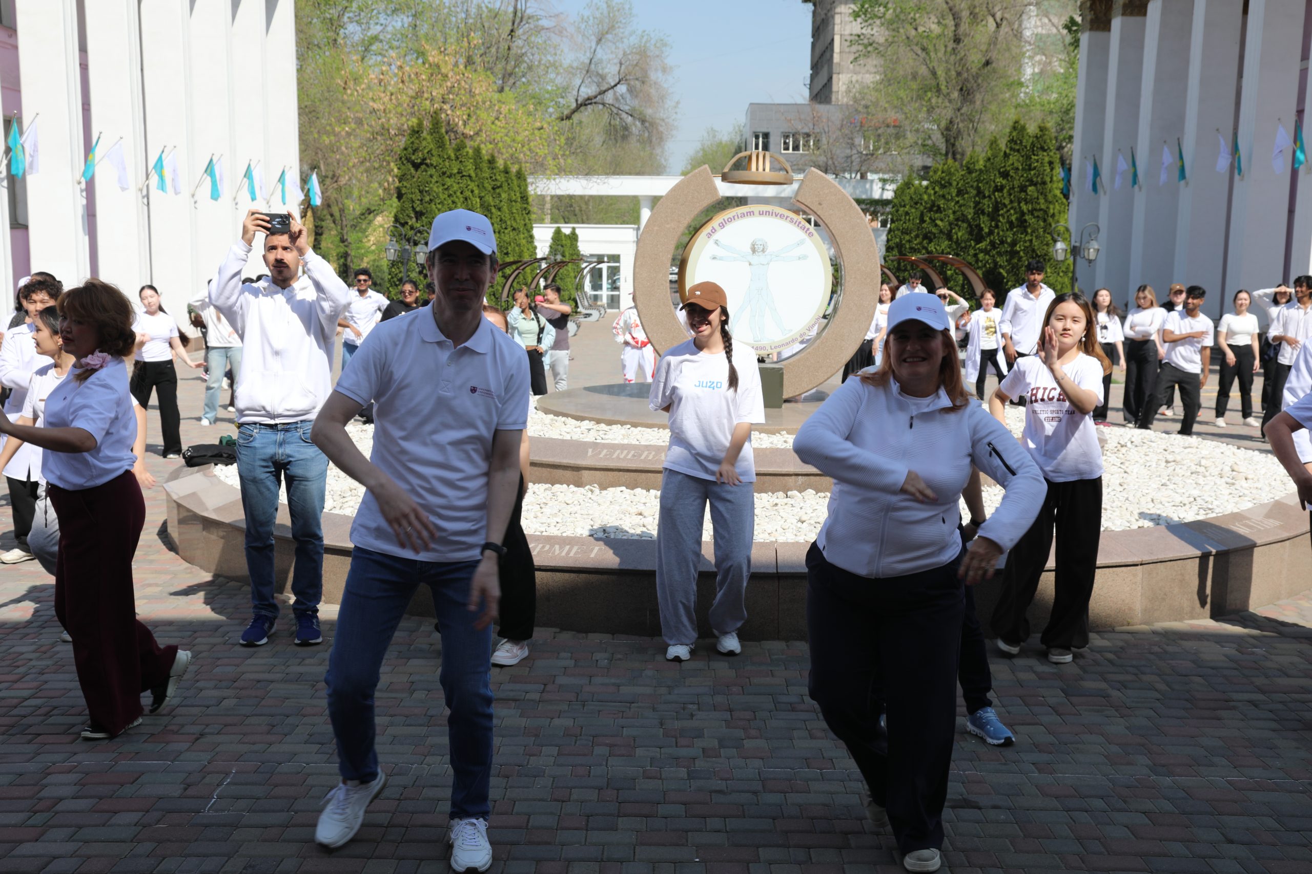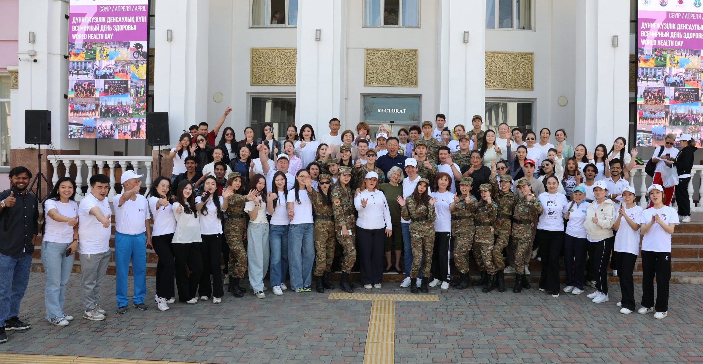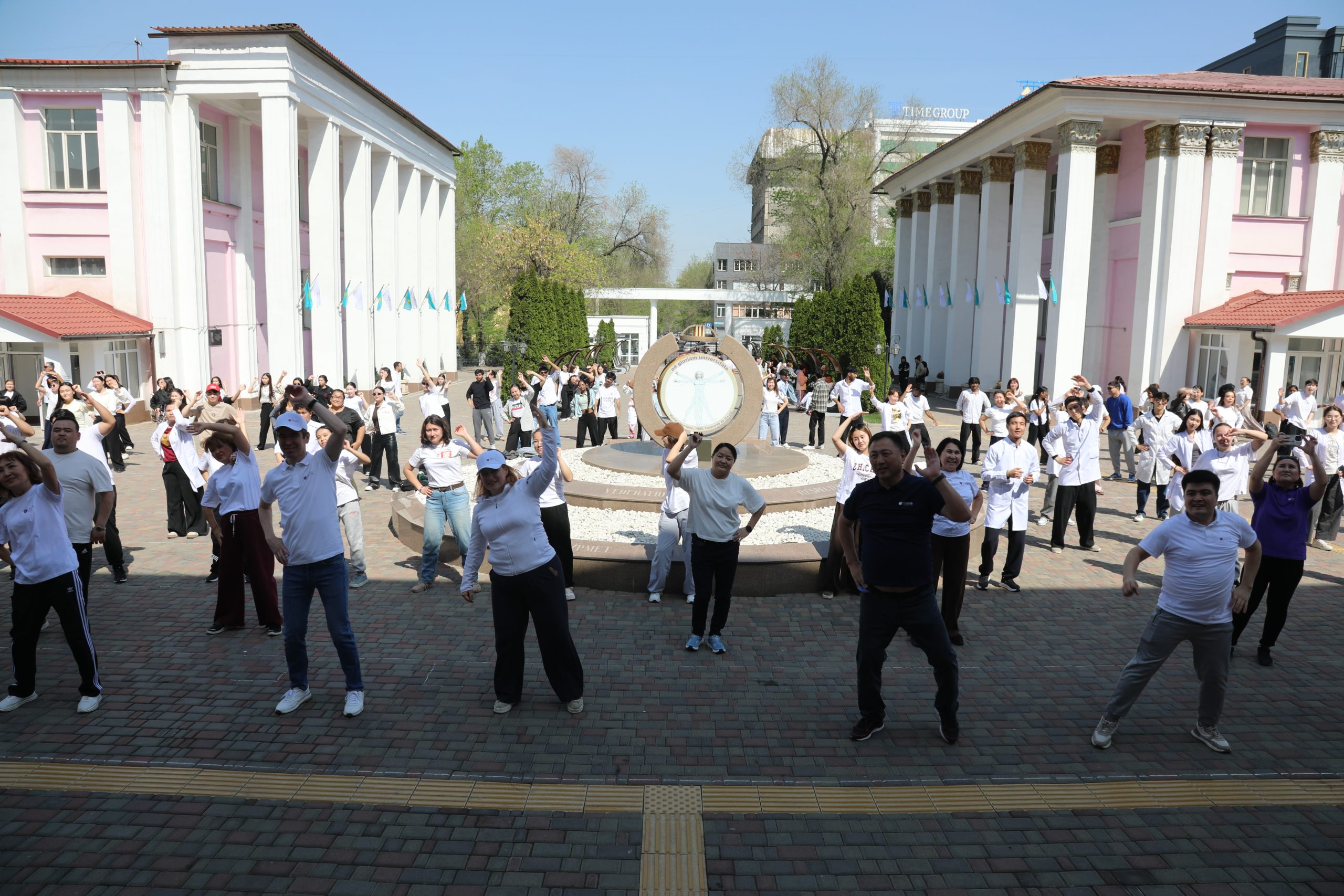 В Казахском национальном медицинском университете имени С. Д. Асфендиярова 7 апреля состоялся масштабный флешмоб, приуроченный ко Всемирному дню здоровья. В акции приняли участие студенты, преподаватели, сотрудники университета, а также ректор КазНМУ Марат Шоранов и руководитель Европейского центра ВОЗ по первичной медико-санитарной помощи в Алматы д-р Мелитта Якоб.