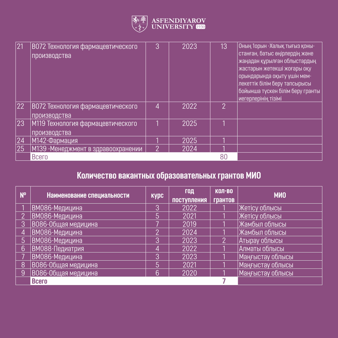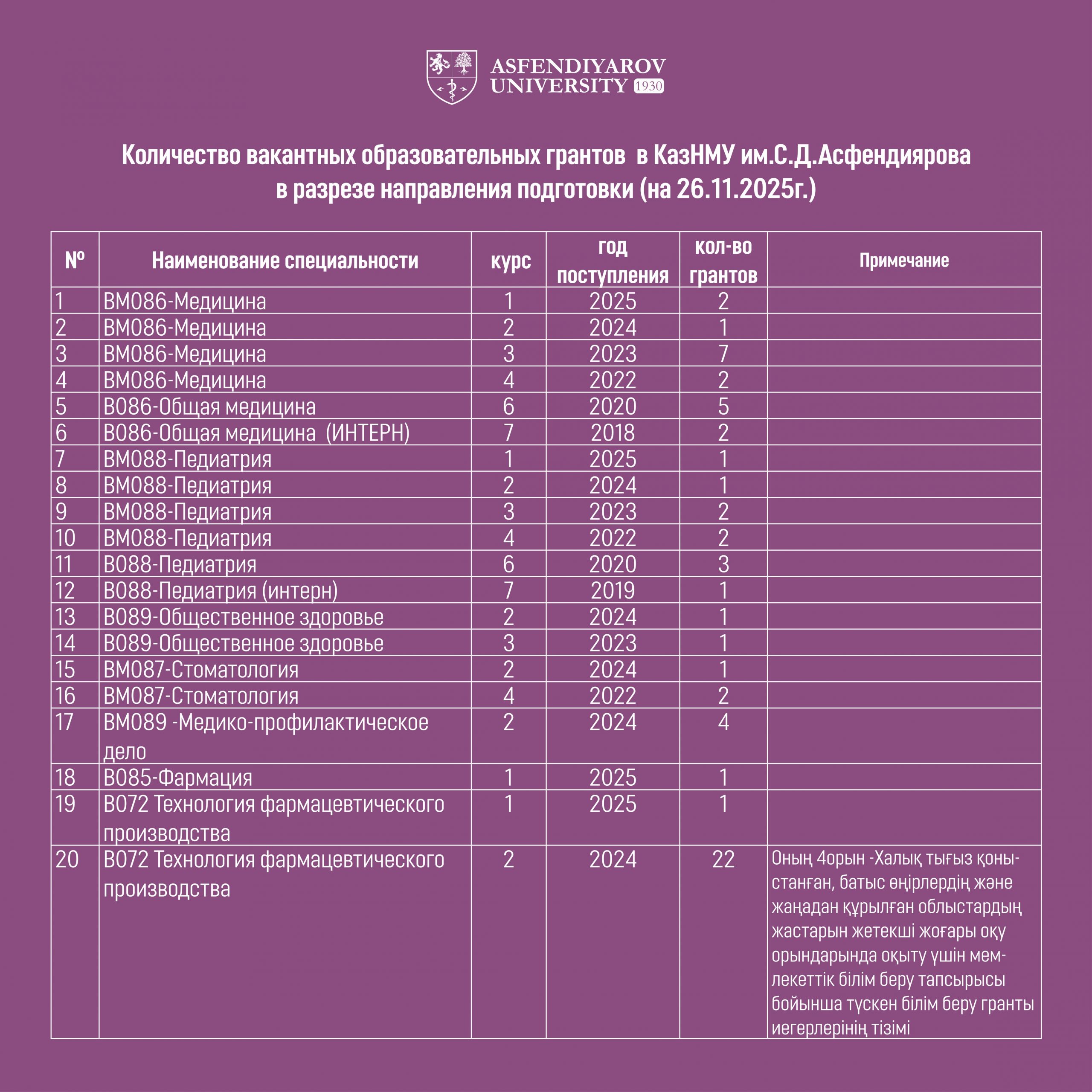Всем обучающимся на платной основе в НАО «Казахский Национальный Медицинский Университет имени С.Д. Асфендиярова», желающим участвовать в конкурсе по присуждению вакантных образовательных грантов, высвободившихся в процессе получения высшего образования (Приложение 1), необходимо подать заявление на участие в конкурсе по переводу с платной основы обучения на вакантный государственный образовательный грант с 15 декабря 2025 года по 30 декабря 2025 года включительно: