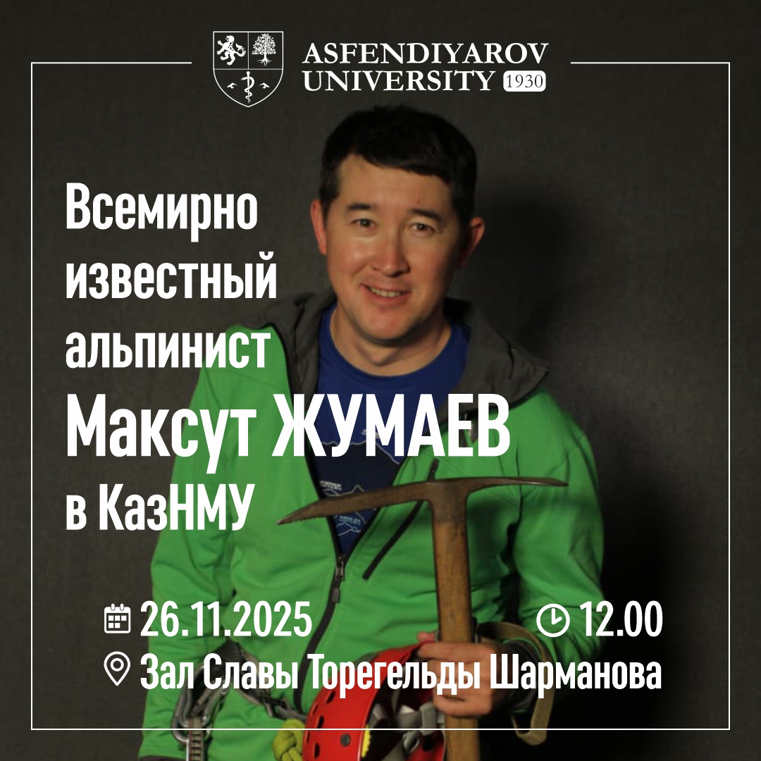 26 ноября в Казахском национальном медицинском университете имени С. Д. Асфендиярова состоится уникальная встреча со всемирно известным альпинистом Максутом Жумаевым – 27-м покорителем всех 14 восьмитысячников планеты и 12-м альпинистом в мире, взошедшим на них без дополнительного кислорода, капитаном сборной альпинистов Республики Казахстан и основателем Kazakh Alpine Club.