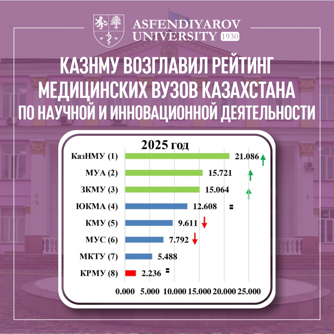 Казахский национальный медицинский университет имени С.Д. Асфендиярова занял 1-е место среди медицинских вузов Казахстана в рейтинговой оценке по показателям научной и инновационной деятельности за 2025 год. Итоговая рейтинговая оценка КазНМУ составила 21,086 балла.