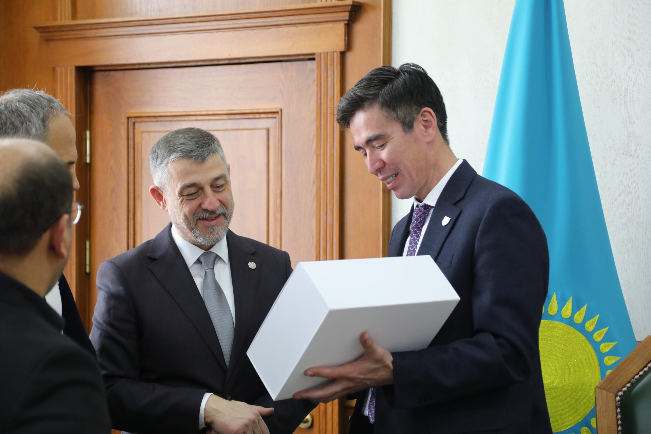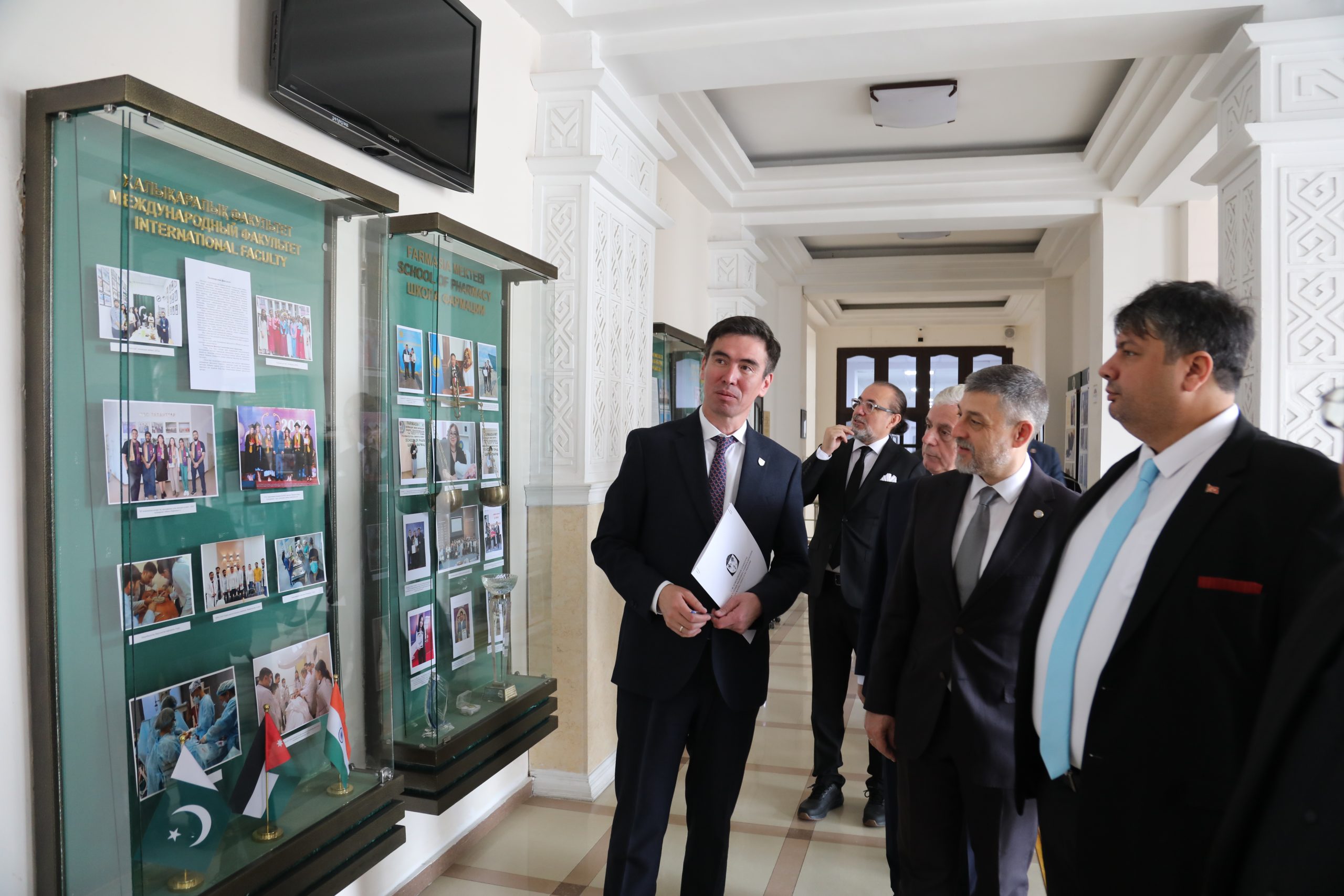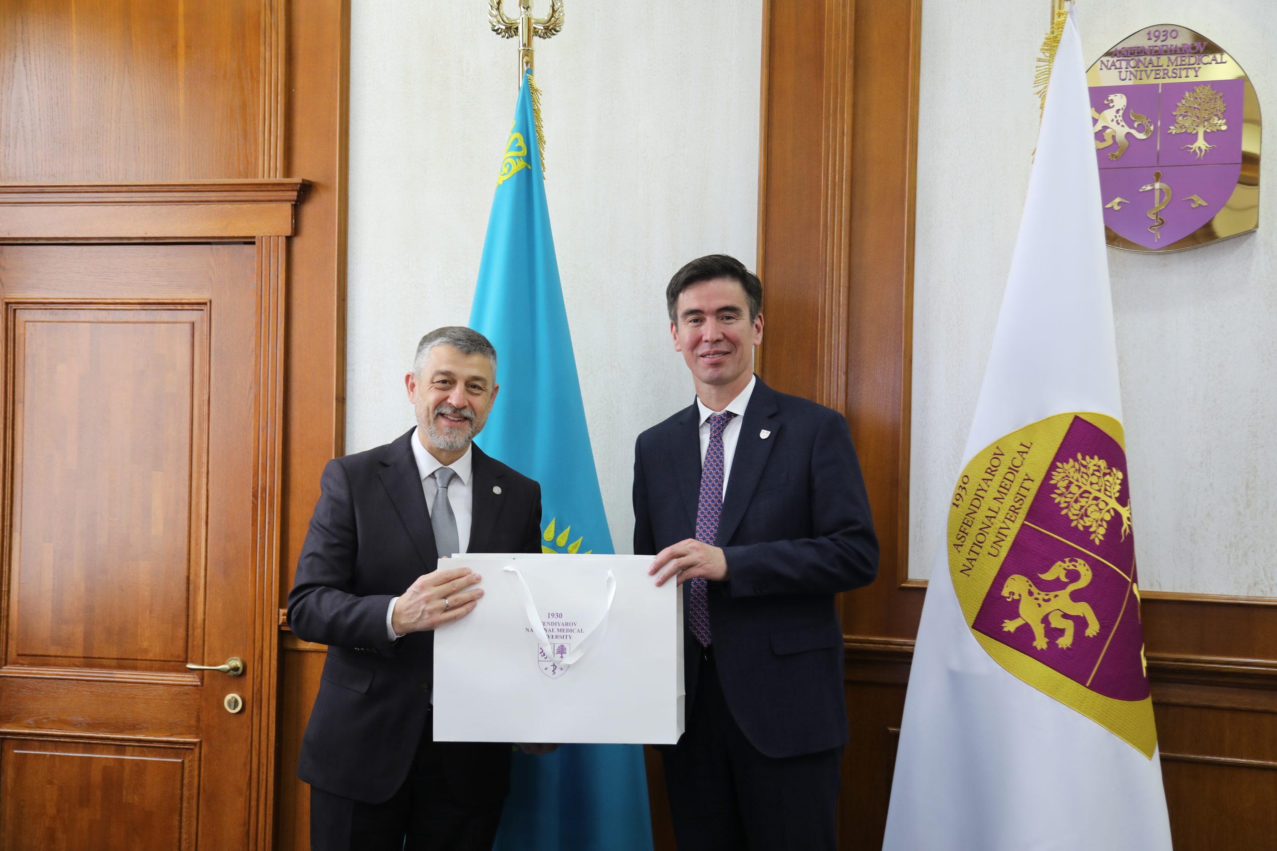 Во встрече приняли участие Ректор КазНМУ профессор Марат Шоранов и проректоры университета, а также Ректор International Vision University профессор Ahmet Vecdi Can, основатель университета профессор Fadıl Hoca и члены международной делегации.