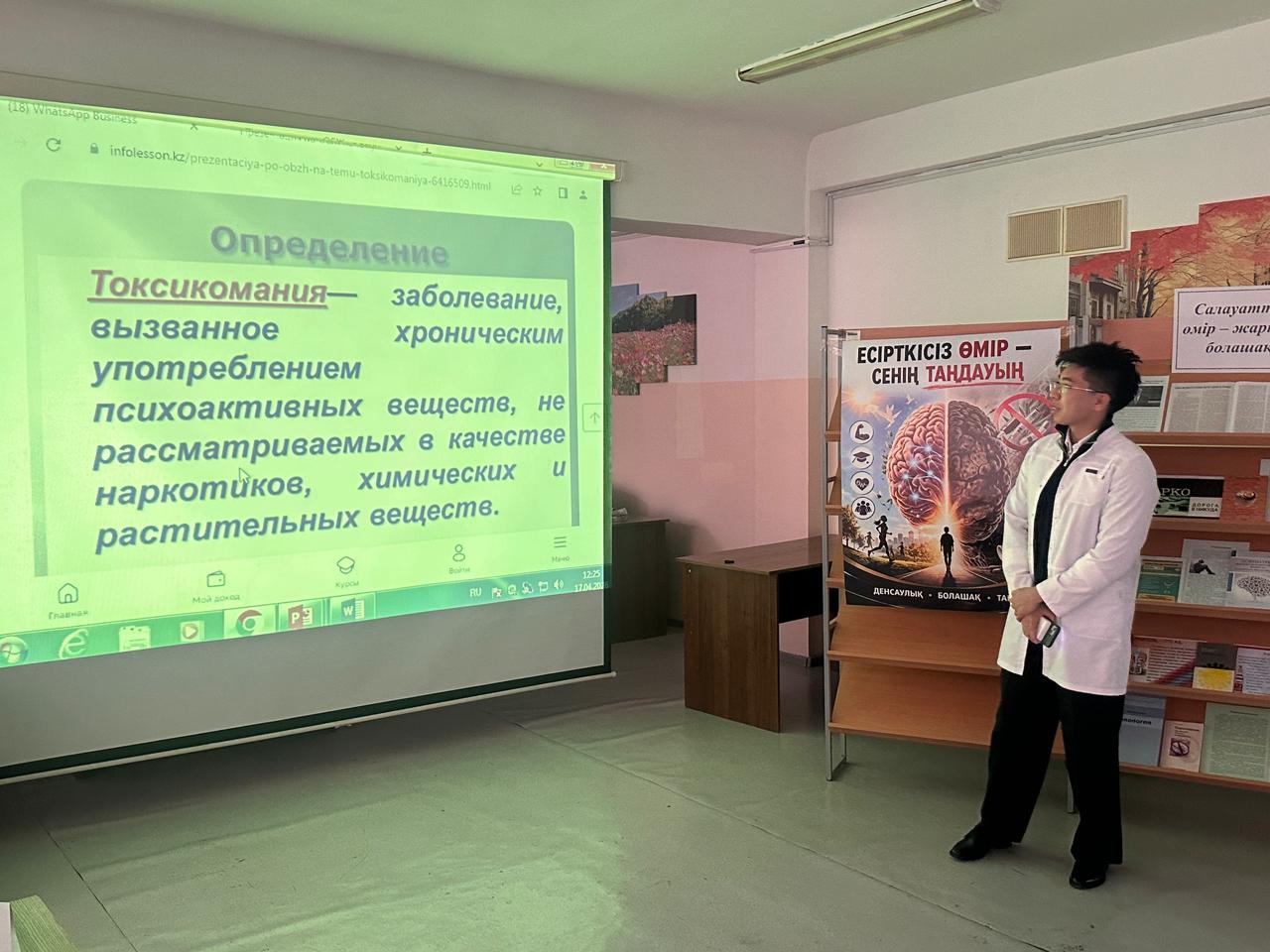 Данная цель направлена на укрепление здоровья населения, профилактику заболеваний и формирование ответственного отношения к здоровью. В рамках мероприятия были представлены содержательные доклады: Аяганов Бекнур выступил с презентацией на тему токсикомании, раскрыв проблему ингаляционного употребления клея среди молодежи. Студенты группы ОЗ23-001: Оразалы Алиман, Алимгазина Амина, Хасенғали Самал представили доклад «Наркотическая зависимость – угроза современного общества». PhD-докторант Дихан М.Д. выступил с научным докладом