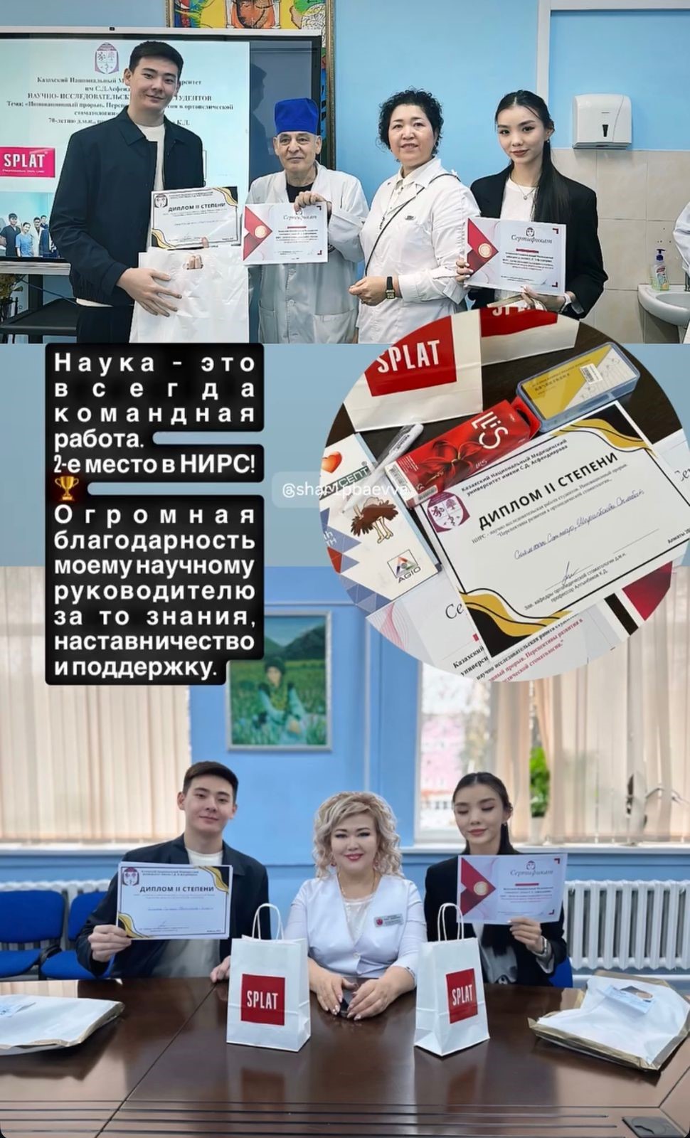 - Приз «Лучшие исследователи»- Архарова Аружан, Кожахмет Инсана, Манукян София, 5 курс СТ21-39р. Тема: «Сравнение точности интраорального сканирования и традиционных методов слепков». Научные руководители: к.м.н. ассоц. профессор Момынова М.М., ассистент Тулеуов С.С.