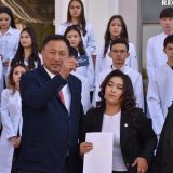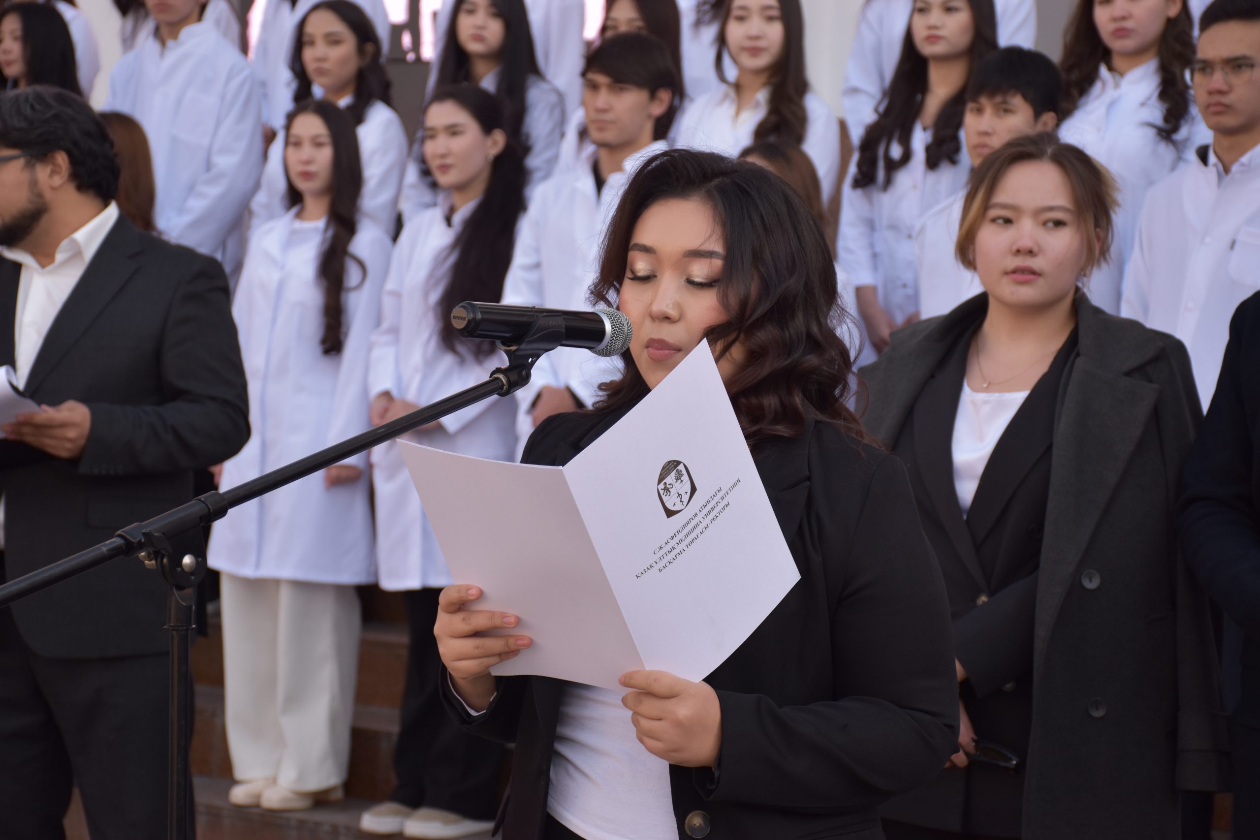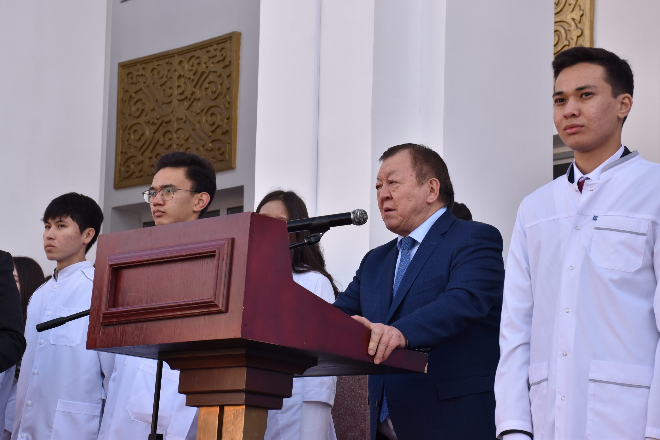 После традиционных напутствий великих учителей — Абая, Абу Али Ибн Сины, Аль-Фараби и Гиппократа, первокурсники произнесли Клятву будущего врача, положив руку на сердце. Будущие врачи поклялись посвятить себя делу врачевания, быть достойными асклепиадов и хранить честь профессии.