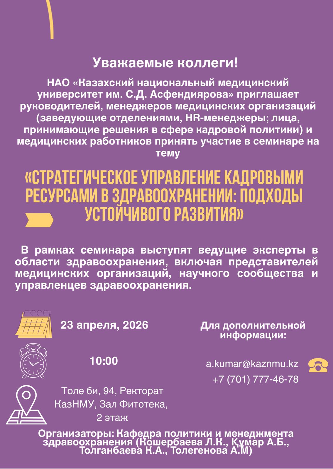 НАО «Казахский национальный медицинский университет им. С.Д. Асфендиярова» приглашает руководителей, менеджеров медицинских организаций (заведующие отделениями, HR-менеджеры; лица, принимающие решения в сфере кадровой политики) и медицинских работников принять участие в семинаре на тему: «Стратегическое управление кадровыми ресурсами в здравоохранении: подходы устойчивого развития», который пройдет 23 апреля 2026 года.