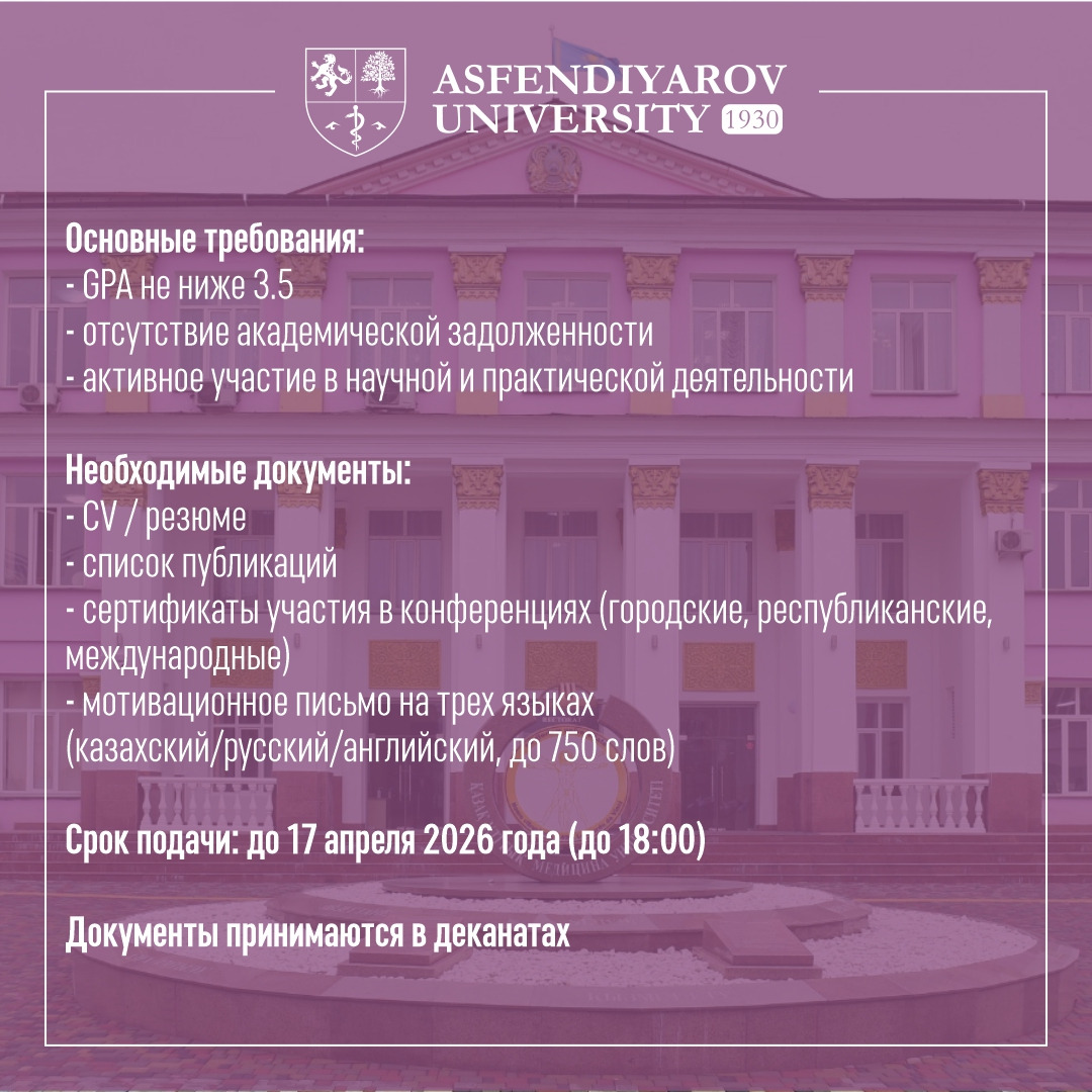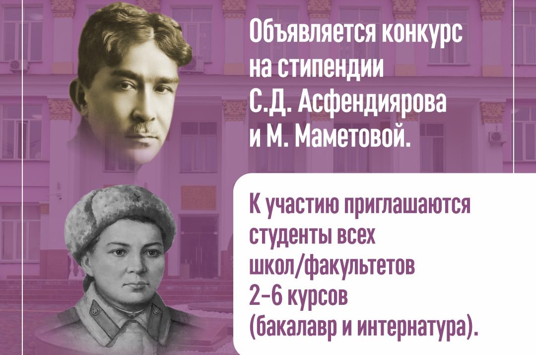 Уважаемые обучающиеся КазНМУ! Объявляется конкурс на стипендии С.Д. Асфендиярова и М. Маметовой.