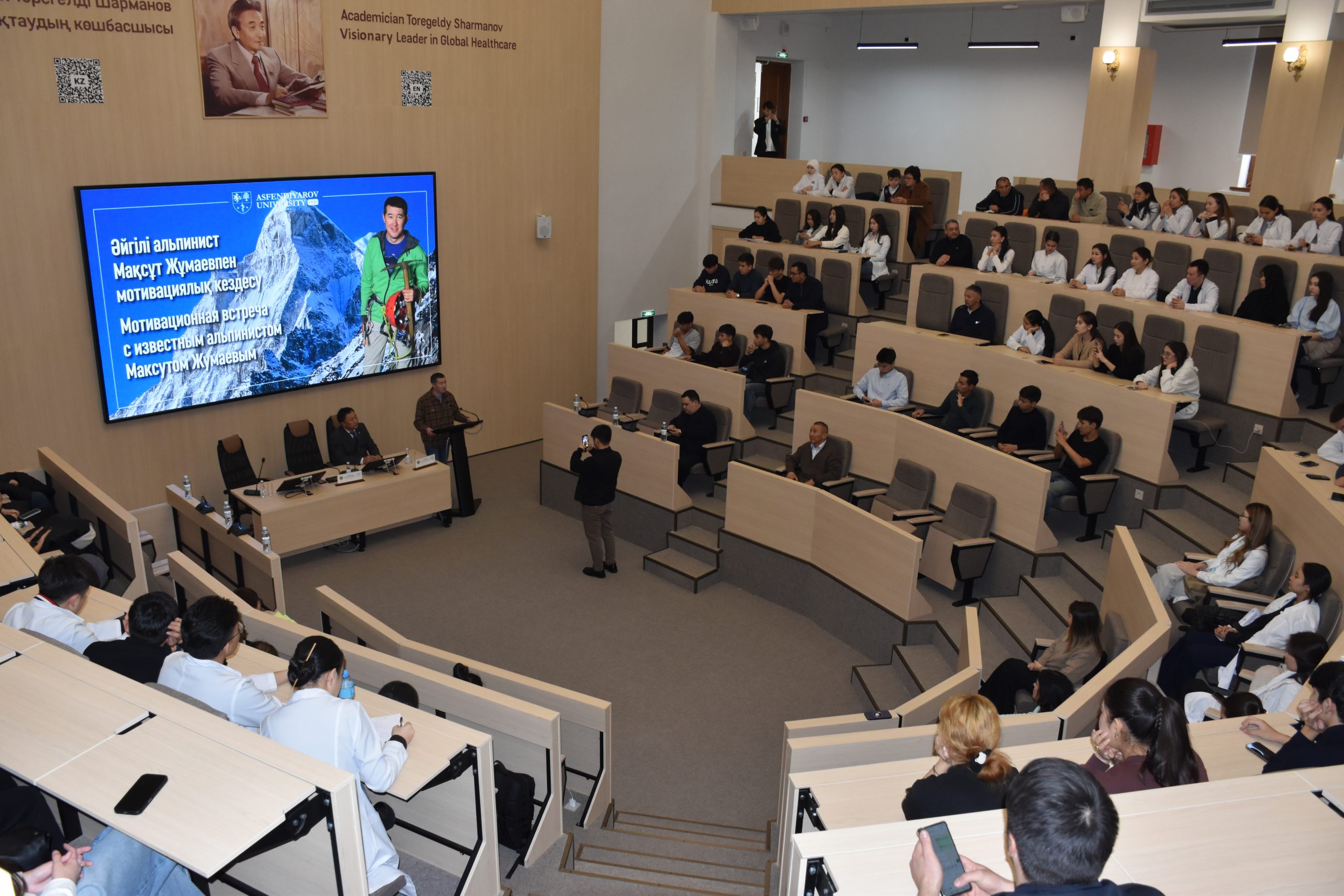 В Казахском национальном медицинском университете имени С. Д. Асфендиярова состоялась встреча, которая сразу же стала событием не только для студентов, но и для всего университета. В гости к будущим врачам пришел человек, имя которого давно стало символом казахстанского альпинизма, — Максут Жумаев, капитан сборной альпинистов Республики Казахстан, основатель Kazakh Alpine Club, двадцать седьмой покоритель всех четырнадцати восьмитысячников планеты и двенадцатый альпинист в мире, сумевший взойти на них без дополнительного кислорода.