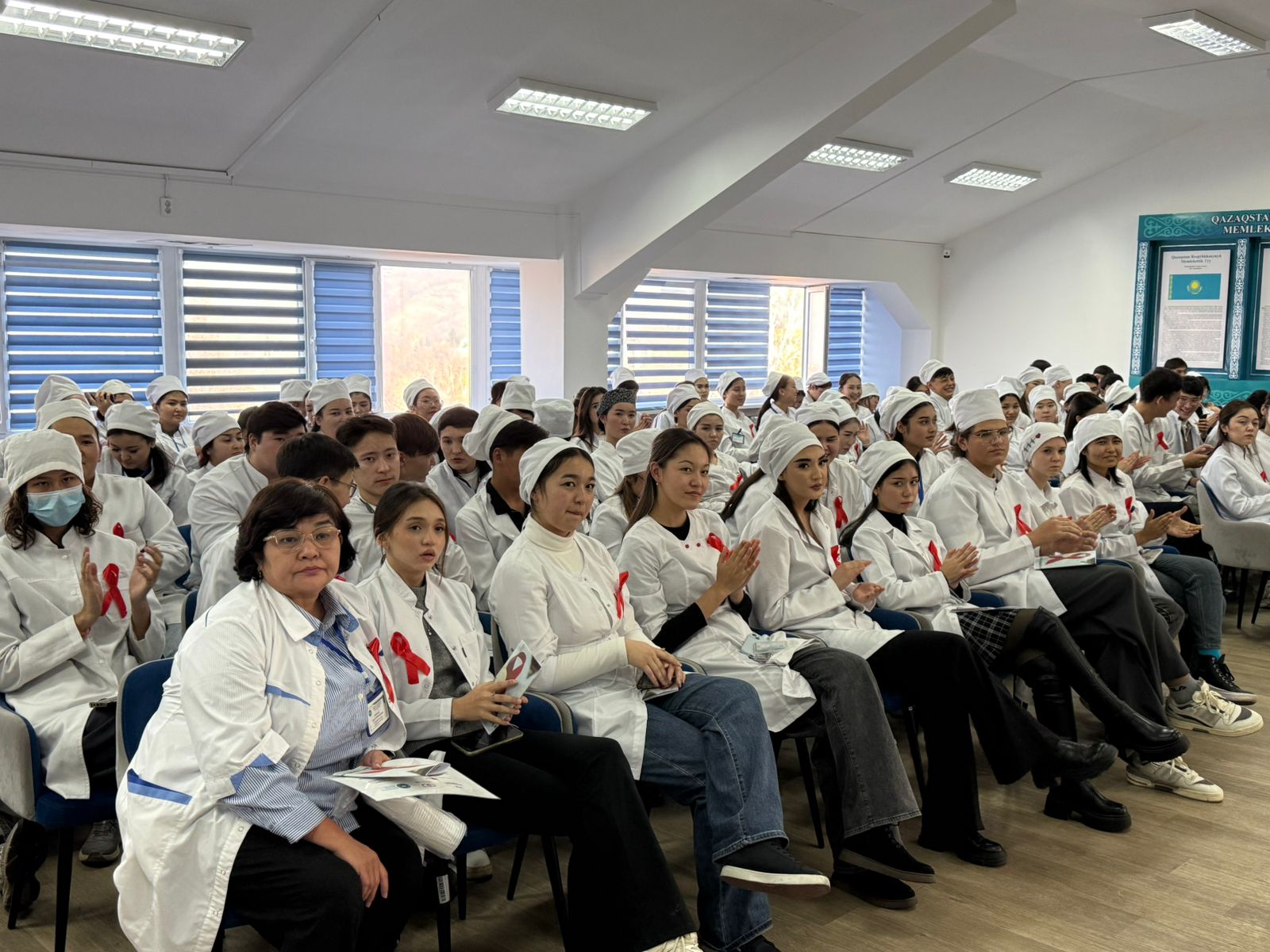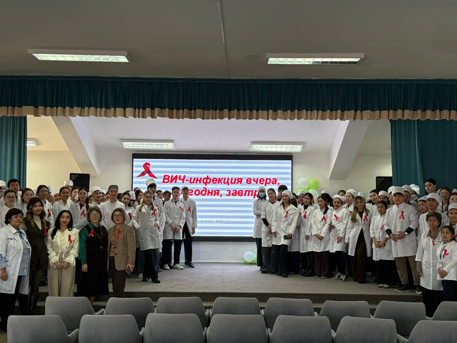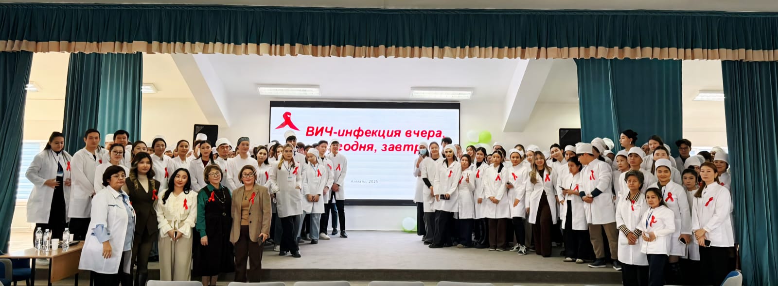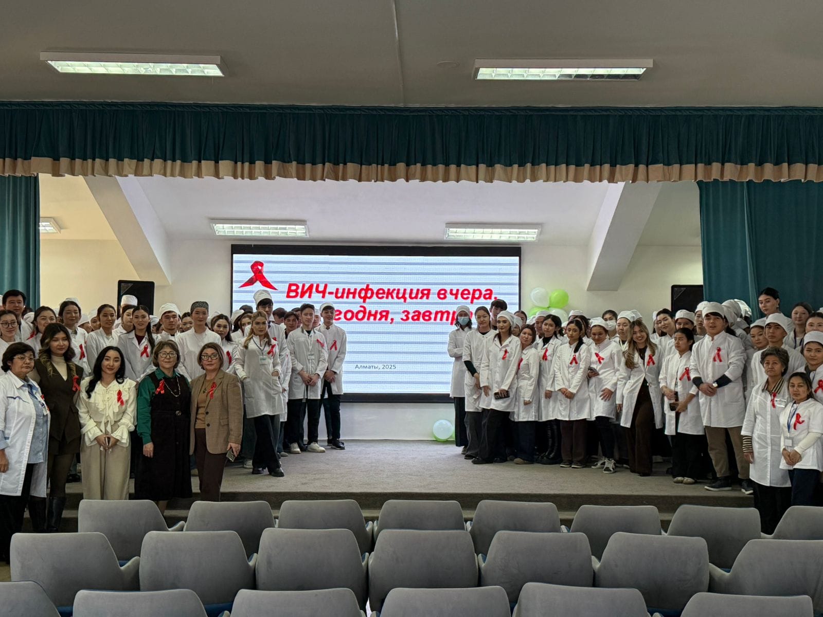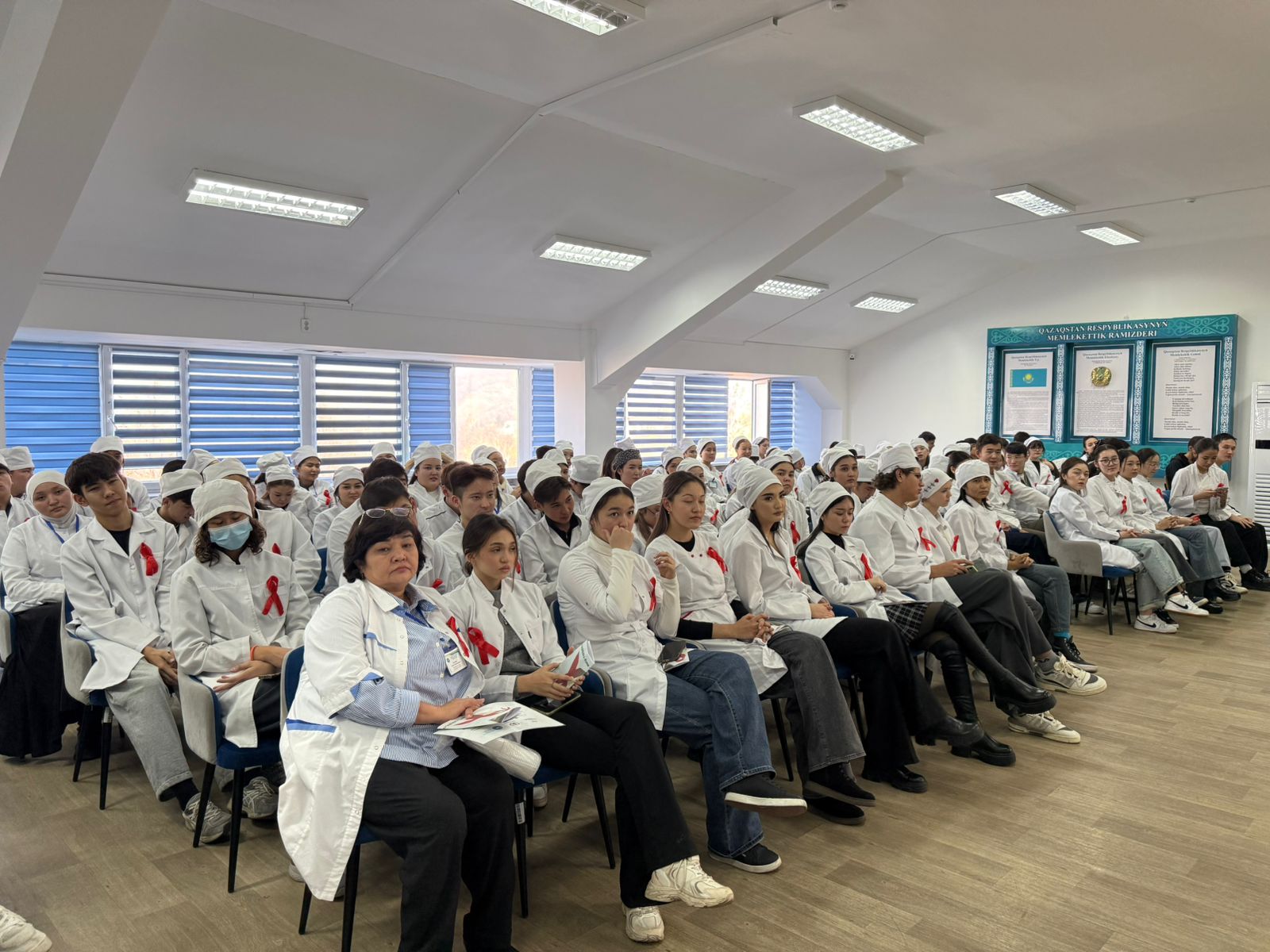 “At the initiative of 3rd- and 4th-year students of the H. Dosmukhamedov School of Public Health, and within the framework of Sustainable Development Goal 3 — ‘Ensure healthy lives and promote well-being for all at all ages’ — a scientific and practical conference titled ‘AIDS: Yesterday, Today, Tomorrow’ was held on December 1, 2025, at the Almaty Medical College with the participation of 150 students.”