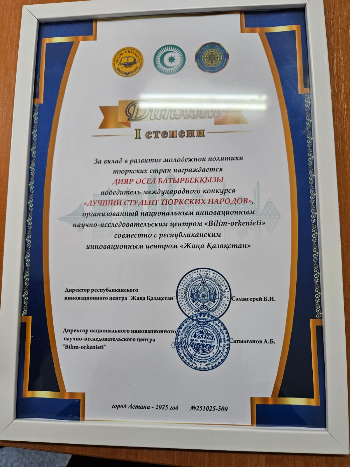 Fifth-year student of the educational program «Pharmacy» Diyar Assel Batyrbekkyzy, on October 24, 2025, became the winner of the International Competition «Best Student of Turkic Peoples», organized by the National Innovative Research Center «BILIM-ORKENIETI» together with the Republican Innovative Center «ZHANA KAZAKSTAN», and was awarded a First Degree Diploma for her contribution to the development of youth policy in Turkic countries.