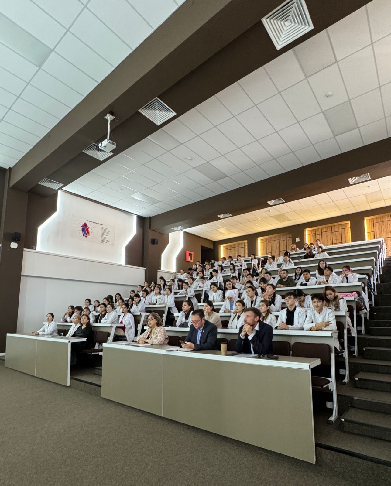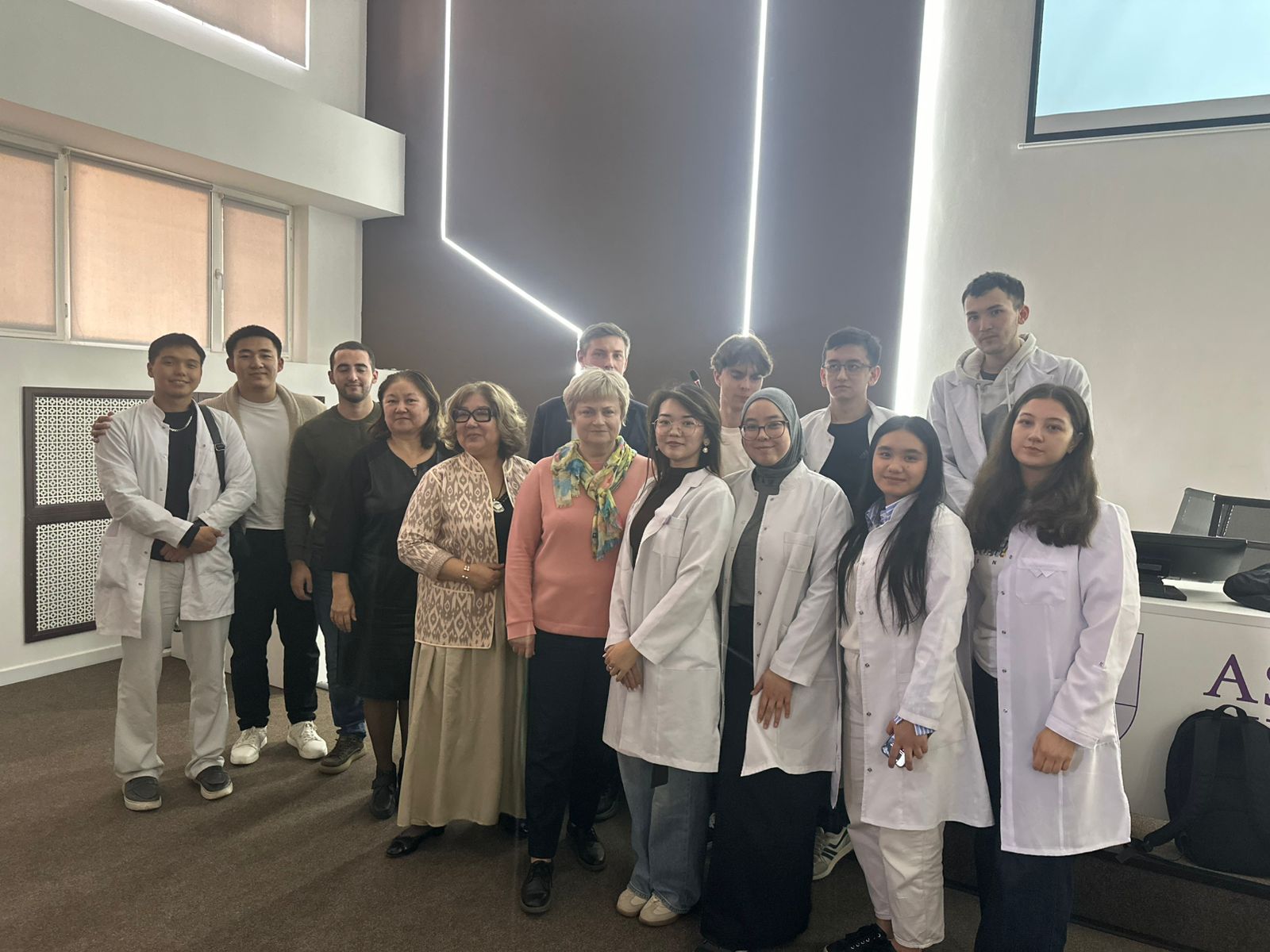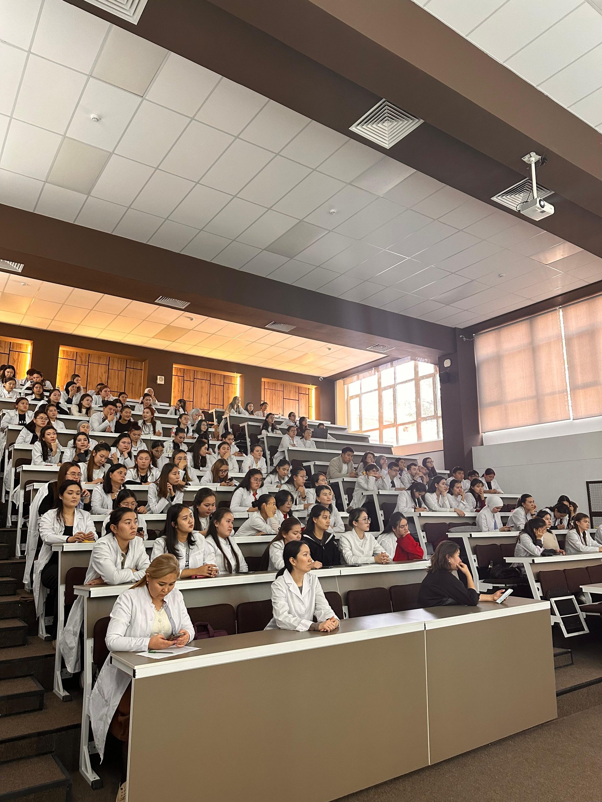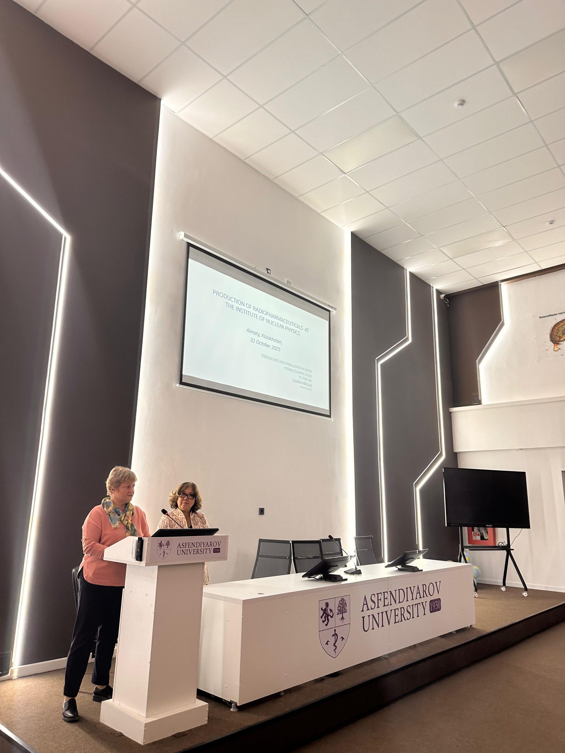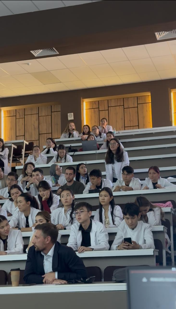 On 31 October 2025, a motivational meeting was held at the S.D. Asfendiyarov KazNMU between 3rd and 4th year students of the School of Pharmacy and leading specialists from the Scientific and Technical Centre for Radiochemistry and Isotope Production of the RSE at the Institute of Nuclear Physics — Elena Tikhonovna Chakrova and Andrey Nikolaevich Gurin. The event was held as part of the production and pre-diploma internships and was organized with the aim of broadening the professional horizons of students, increasing their interest in modern radiopharmaceuticals, and preparing them for future work in the field of nuclear medicine. It should be noted that the discipline ‘Fundamentals of Radiopharmaceutical Production’ has been successfully introduced at the Department of Pharmaceutical Technology under the guidance of Head G.O. Ustenova.