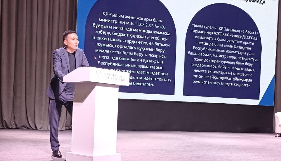 Representative of JSC “Financial Center”, A. Tynybekov, gave a detailed presentation on the mechanisms for monitoring and controlling the mandatory three-year employment period, the rules for notifying about employment, and the procedures for interaction with graduates through the 1414 system.