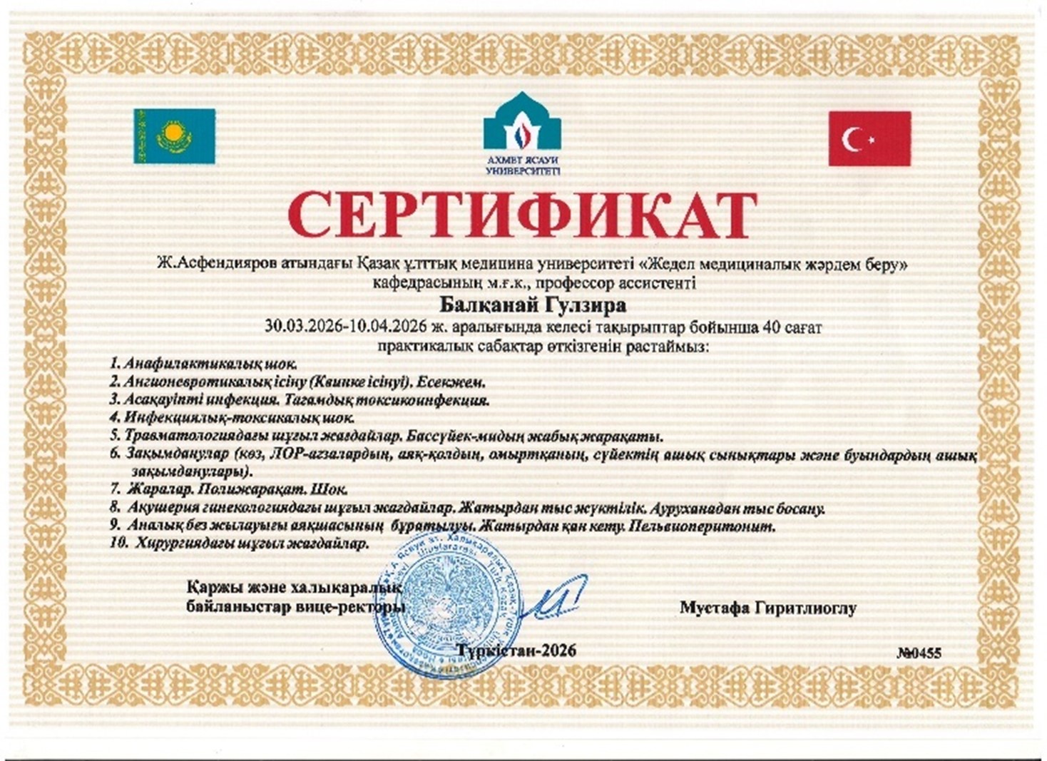 * Балқанай Г.Б., м.м.н., Жедел және шұғыл медициналық көмек кафедрасының ассистент-профессоры.