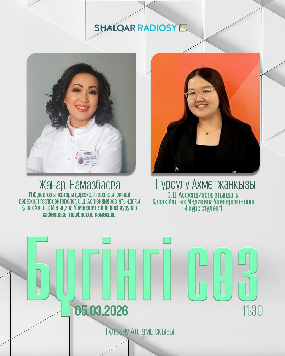 Шалқар Ұлттық арнасының «Бүгінгі сөз» бағдарламасында «Ішкі аурулардың қауіп-қатері мен емі» тақырыбында арнайы шығарылым өтті. Бағдарламаға Ішкі аурулар кафедрасының профессор көмекшісі, PhD докторы, жоғары дәрежелі терапевт, екінші дәрежелі гастроэнтеролог Намазбаева Жанар Ертайқызы және Медицина-2 мектебінің 4 курс, 024-тобының студенті Қуанышова Нұрсұлу Ахметжанқызы қатысты.