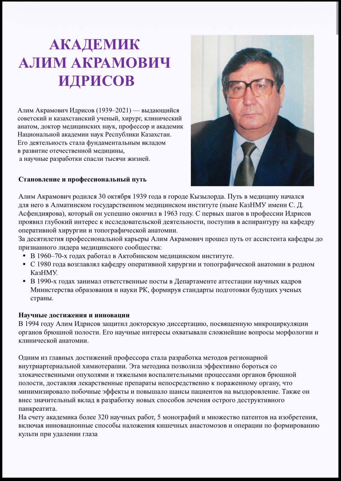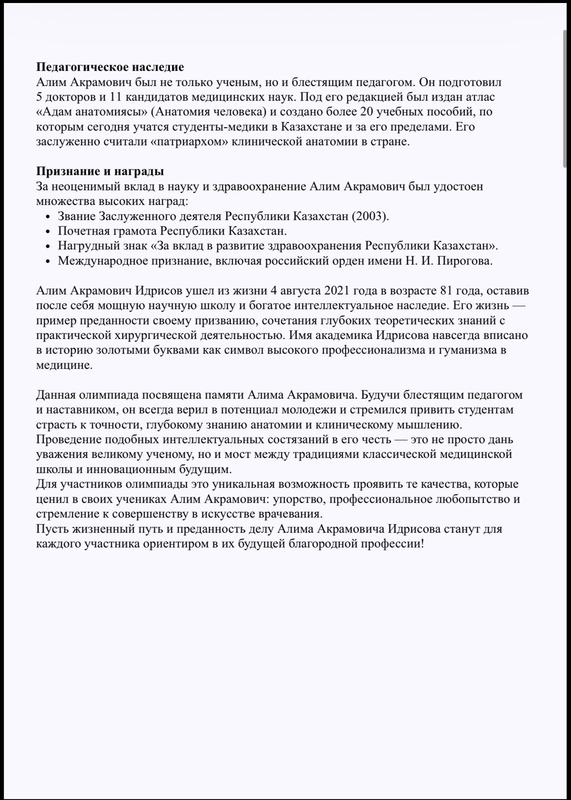 Бұл олимпиада – көрнекті хирург, клиникалық анатом, ғалым және ұстаз, медицина ғылымының дамуына зор үлес қосқан Алим Акрамович Идрисовтың құрметіне арналған.