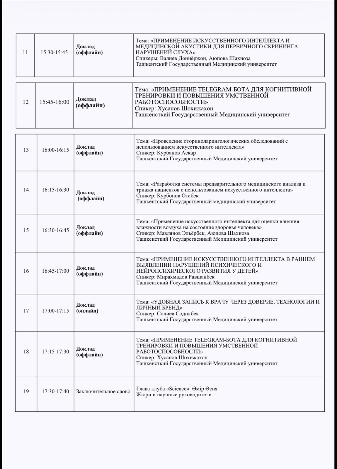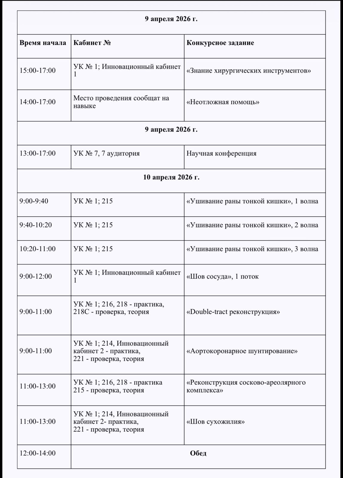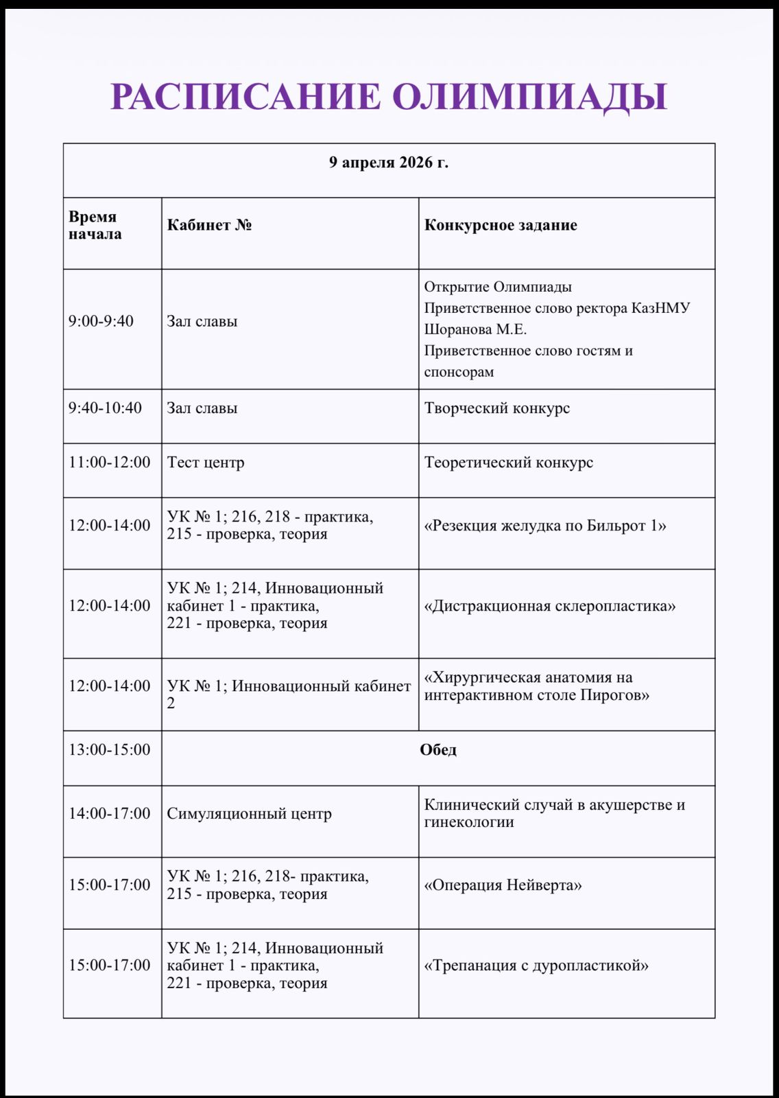 Бірінші күні қатысушыларды олимпиаданың ашылуы, теориялық және шығармашылық сайыстар, практикалық хирургиялық кезеңдер, симуляциялық тапсырмалар және ғылыми конференция күтіп тұр. Екінші күні – жаңа практикалық сынақтар, тамырлық және ішек тігісі бойынша конкурстар, реконструктивті және торакалдық хирургия кезеңдері, хирургиялық түйіндерді байлау бойынша финал және салтанатты қорытындылау өтеді.