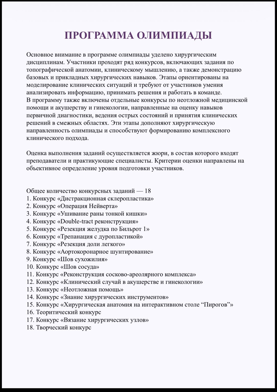 Бұл олимпиада – болашақ хирургтар үшін кәсіби шеберлікті шыңдайтын ауқымды алаң. Қатысушылар клиникалық тәжірибеге барынша жақындатылған күрделі кезеңдерден өтеді. Бағдарлама 18 конкурстық тапсырманы қамтиды, олардың ішінде: Бильрот I бойынша асқазан резекциясы, аортокоронарлық шунттау, трепанация және дуропластика, өкпе бөлігін резекциялау, жіңішке ішек жарасын тігу, тамыр және сіңір тігісі, Нейверт операциясы, емізік-ареолярлық кешенді реконструкциялау, сондай-ақ шұғыл көмек, акушерия және гинекология, хирургиялық құралдарды білу, хирургиялық түйіндер байлау, «Пирогов» интерактивті үстелінде топографиялық анатомия, теориялық және шығармашылық кезеңдер бар.