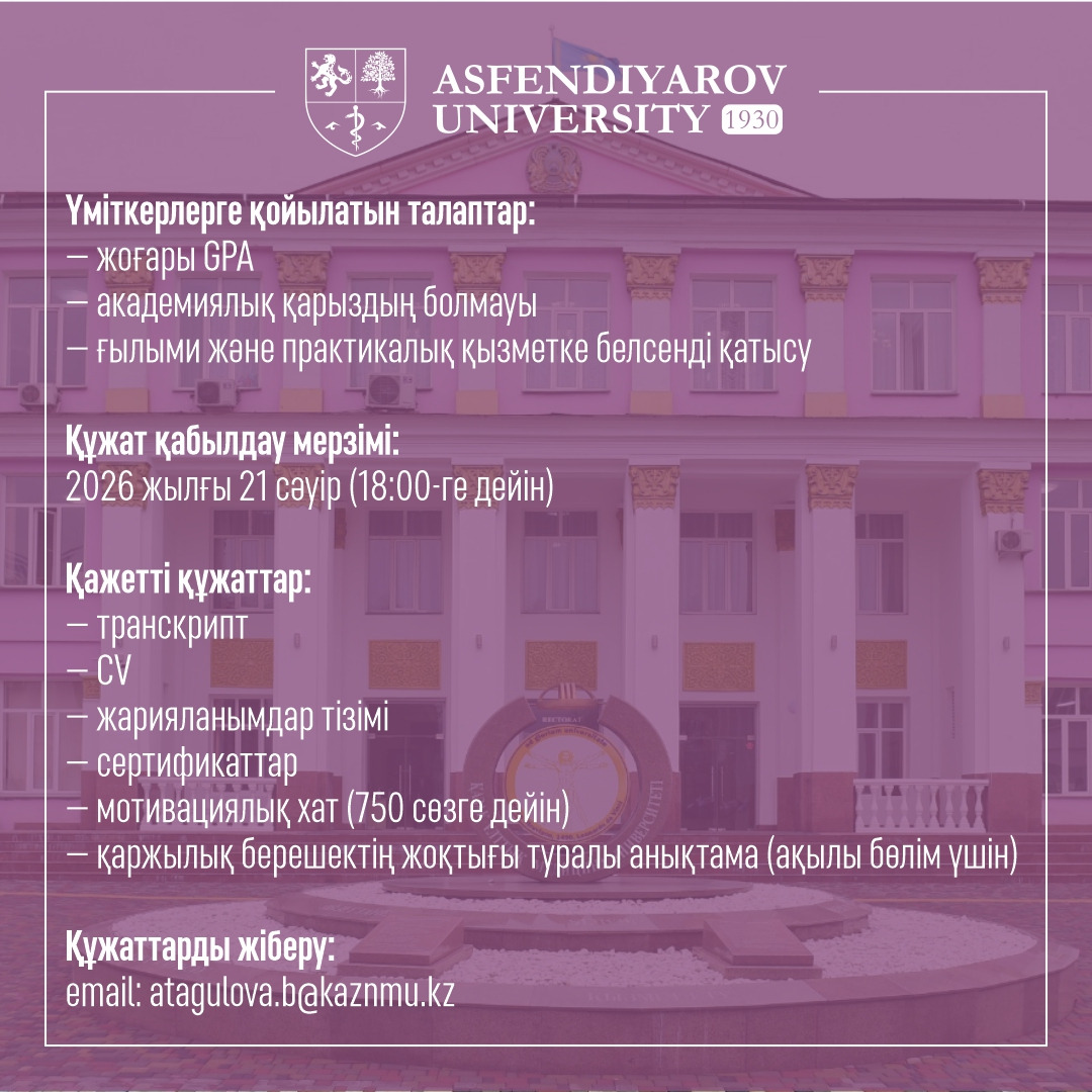 «Жалпы хирургия» мамандығы бойынша резиденттері үшін (бітіруші курстан басқа) академик Б.Б. Баймаханов атындағы атаулы шәкіртақыға конкурс жарияланады
