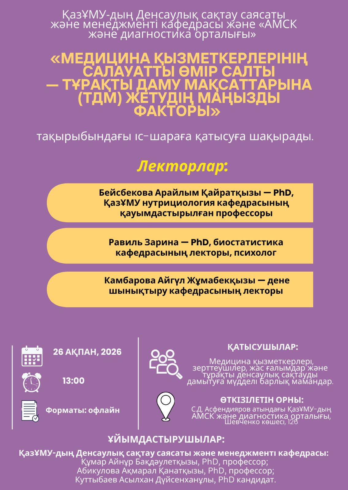 «Медицина қызметкерлерінің салауатты өмір салты – Тұрақты даму мақсаттарына (ТДМ) жетудің маңызды факторы» тақырыбында іс-шара өтеді