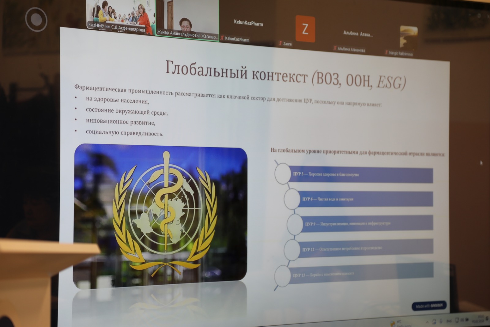 2026 жылғы 5 ақпанда С. Ж. Асфендияров атындағы Қазақ ұлттық медицина университетінде «Экологиялық қауіпсіз фармацевтикалық препараттарды әзірлеу» тақырыбында дөңгелек үстел өтті. Іс-шара университеттің «Жасыл университет» стратегиясын және Біріккен Ұлттар Ұйымының Тұрақты даму мақсаттарын жүзеге асыру аясында ұйымдастырылды.