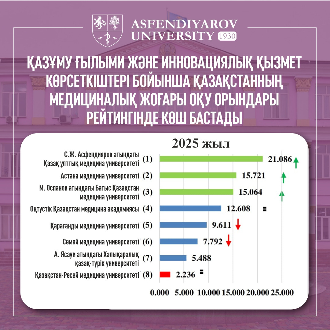 С.Ж. Асфендияров атындағы Қазақ ұлттық медицина университеті 2025 жылдың қорытындысы бойынша ғылыми және инновациялық қызмет көрсеткіштері негізінде жүргізілген рейтингтік бағалауда Қазақстанның медициналық жоғары оқу орындары арасында 1-орынға ие болды. ҚазҰМУ-дың жиынтық рейтингтік көрсеткіші 21,086 балды құрады.