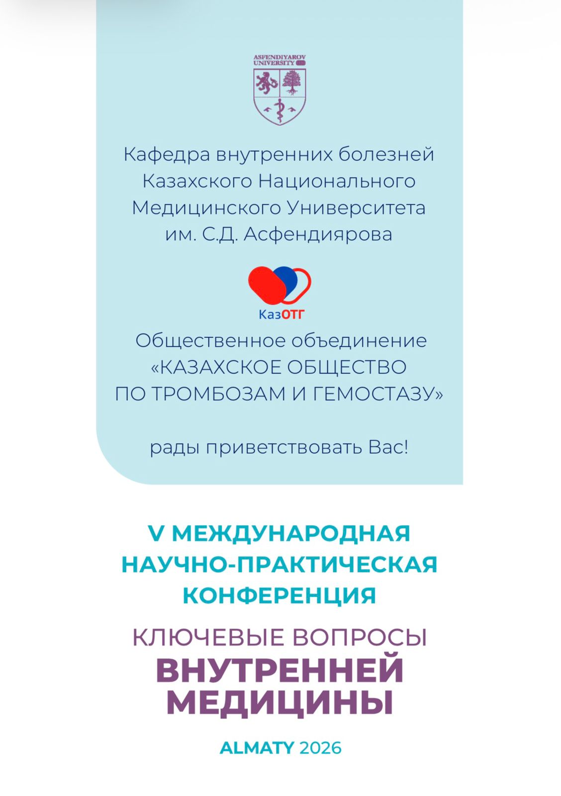 Общественное объединение «Казахское общество по тромбозам и гемостазу» (КазОТГ) и кафедра внутренних болезней КазНМУ им. С.Д. Асфендиярова приглашают Вас принять участие в